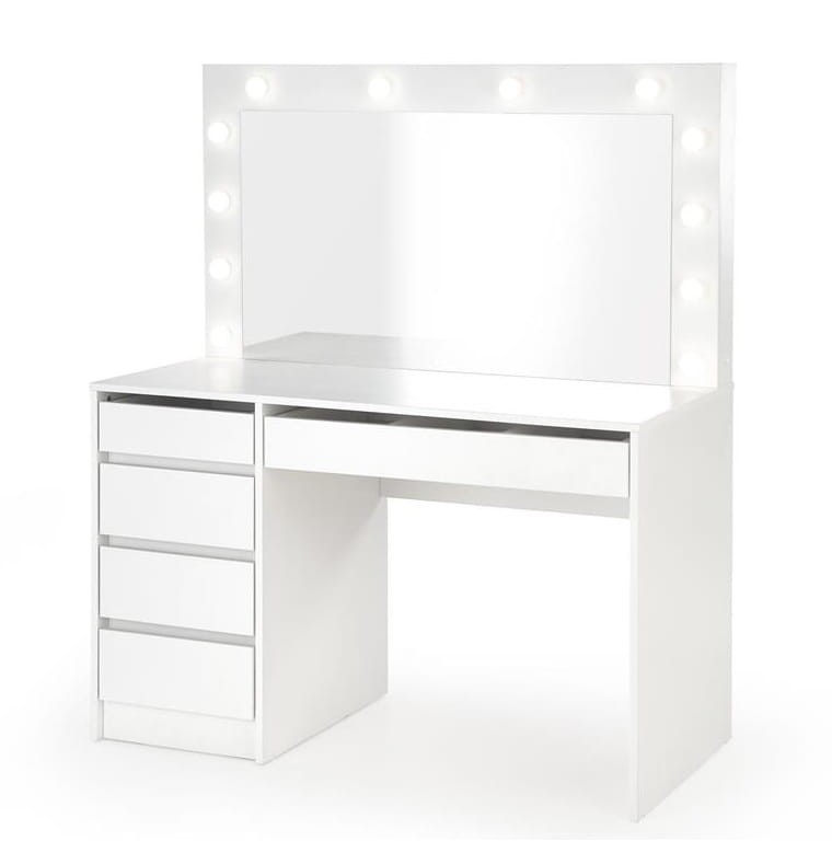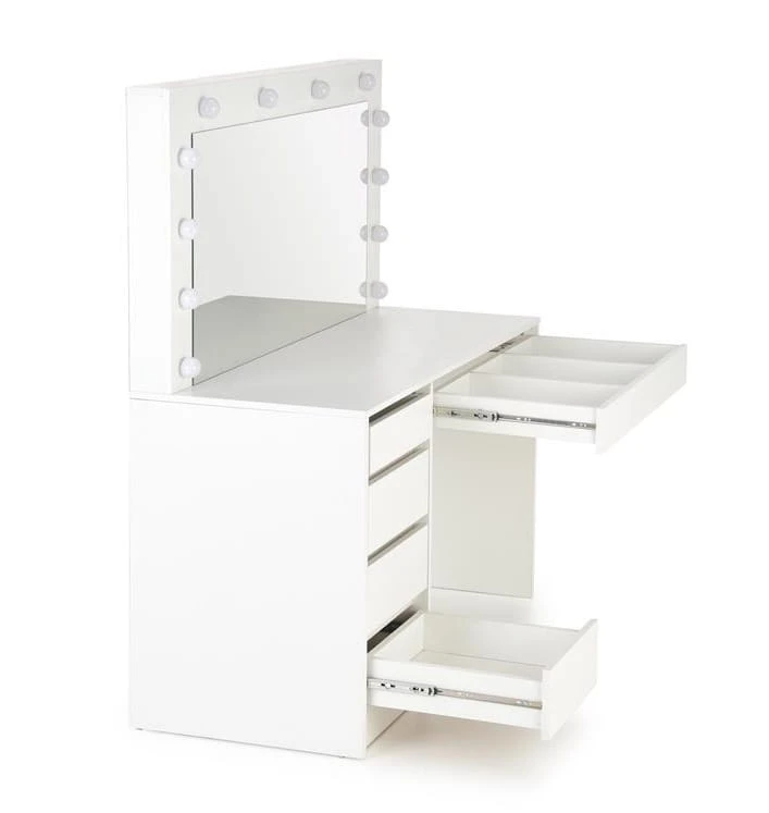 Cała konstrukcja toaletki Samantha została wykonana z płyty meblowej okleinowanej, która odporna jest na zarysowania i zabrudzenia. Dzięki temu nie trzeba martwić się, że biała toaletka zamieni się w paletę barw po intensywnych pomadkach, cieniach i podkładach.