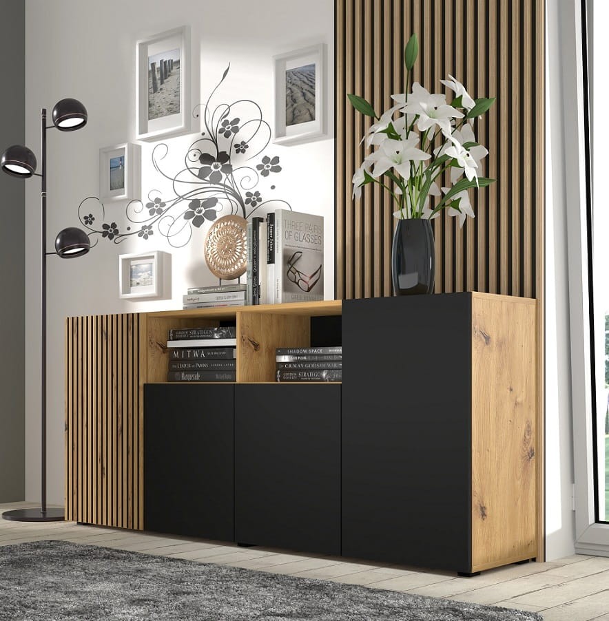 Komoda z lamelami to efekt nowoczesnej myśli designerskiej. Ma stonowaną kolorystkę. Połączono tu odcień naturalnego drewna w wybarwieniu dębu artisan z matową, głęboką czernią. Kropkę nad "i" stanowią ultra modne lamele, nadającego projektowi sznytu.