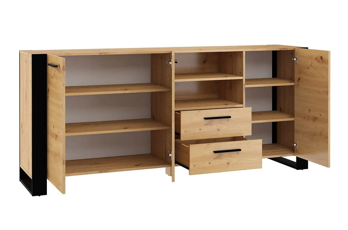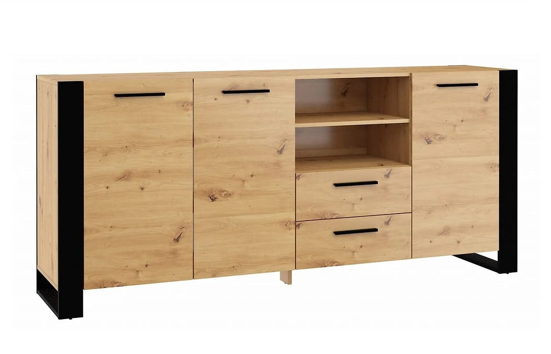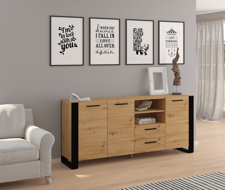 Mamy tu jasne, piękne wybarwienie w kolorze dębu artisan, przełamane niezwykle głęboką czernią. W tym kolorze są interesujące, duże nogi, zaprojektowane w formie ramy, które to niesamowicie kontrastują z resztą konstrukcji, nadając jej niepowtarzalnego, modnego charakteru. Taki design sprawia, że loftowa komoda doskonale sprawdzi się we wnętrzu industrialnym, wzbogaci nowoczesne i doda sznytu klasycznemu. Możliwości aranżacji jest naprawdę wiele. A przy tym - nieprawdopodobna funkcjonalność.