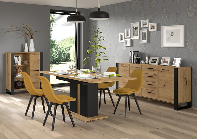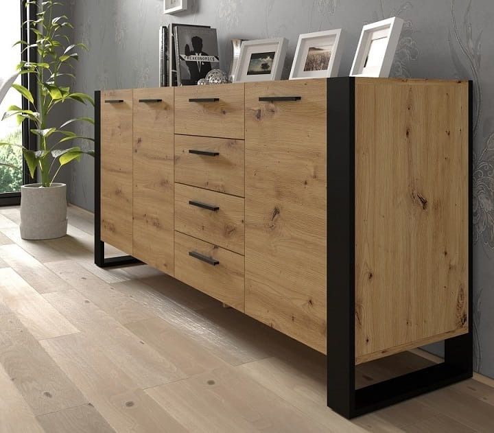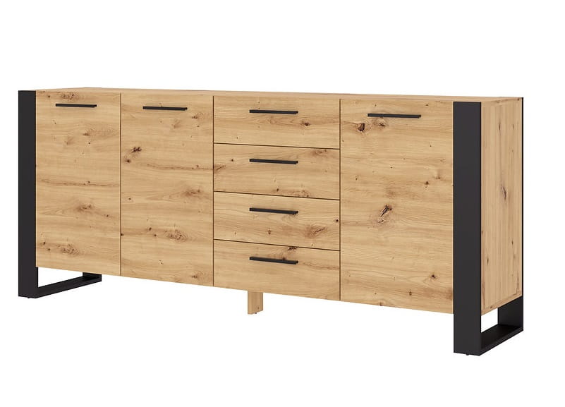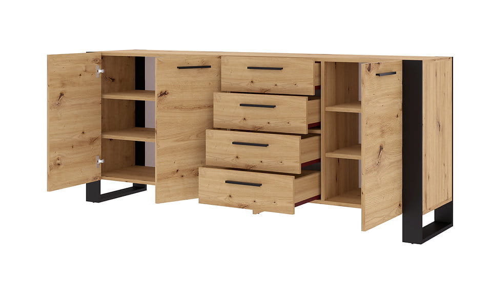Mamy tu jasne, piękne wybarwienie w kolorze dębu artisan, przełamane niezwykle głęboką czernią. W tym kolorze są interesujące, duże nogi, zaprojektowane w formie ramy, które to niesamowicie kontrastują z resztą konstrukcji, nadając jej niepowtarzalnego, modnego charakteru. Taki design sprawia, że loftowa komoda doskonale sprawdzi się we wnętrzu industrialnym, wzbogaci nowoczesne i doda sznytu klasycznemu. Możliwości aranżacji jest naprawdę wiele. A przy tym - nieprawdopodobna funkcjonalność.