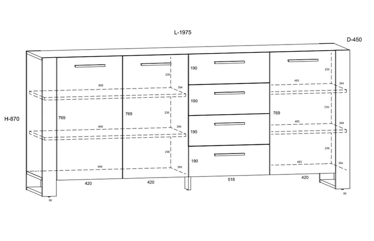 Do dyspozycji użytkowników są zamykane drzwiczkami półki oraz cztery szuflady. Długi blat świetnie posłuży na ustawienie pamiątek czy odłożenie podręcznych drobiazgów. Poza pokaźną ilością przestrzeni do przechowywania rozmaitych rzeczy, w zależności od Państwa potrzeb - uwagę warto zwrócić na interesujący design tego mebla.