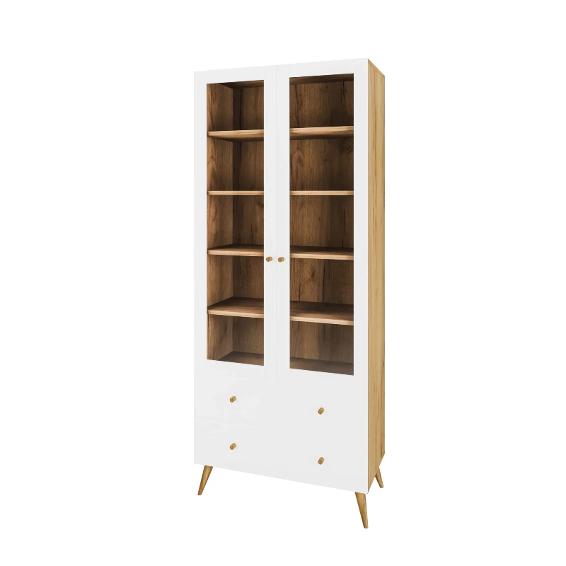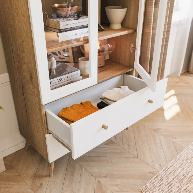 Witryna Albi zachwyca nie tylko pojemnością, ale także designem. Drewniane nóżki dodają lekkości całej konstrukcji i ułatwiają utrzymanie porządku pod meblem. Dzięki nim witryna unosi się nad podłogą, co optycznie powiększa przestrzeń i dodaje wnętrzu nowoczesnego charakteru.