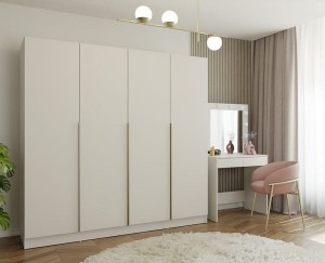 Szafa Syri stanowi część szerszej kolekcji Egbe w kolorze kaszmir, co oznacza, że możesz stworzyć w swoim domu spójną, harmonijną aranżację, łącząc ją z pasującą toaletką, komodą czy regałem z naszej oferty, tworząc tym samym wnętrze o przemyślanym, profesjonalnym charakterze.