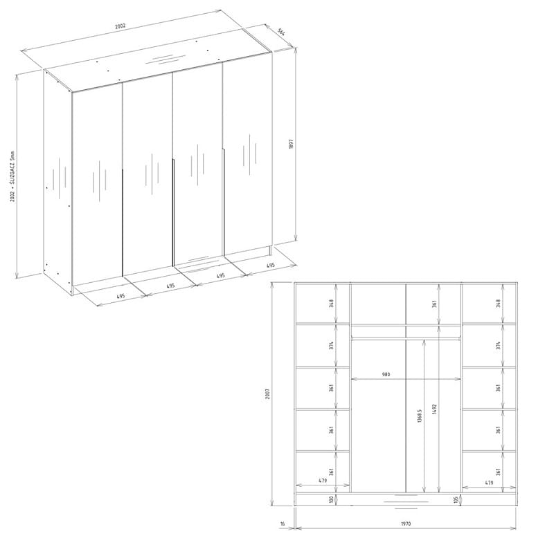 - Wymiary: szerokość - 200 cm, głębokość - 56,5 cm, wysokość - 200 cm