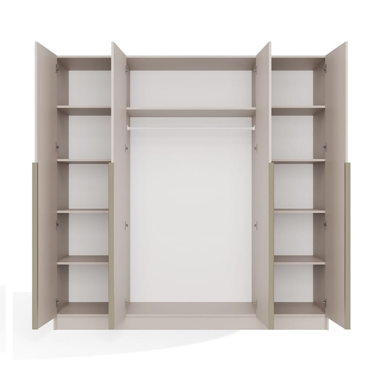 Cztery skrzydła drzwiowe to gwarancja szybkiego i wygodnego dostępu do każdej strefy przechowywania, co oznacza, że już nigdy nie będziesz musiała przeszukiwać całej szafy, żeby znaleźć ulubioną bluzkę czy konkretną parę spodni. To rozwiązanie, które docenisz szczególnie w pośpiechu porannych przygotowań do pracy.