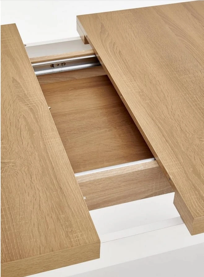 Nogi stołu i prostokątny blat w kolorze białym to najwyżej jakości MDF laminowany. Jest on odporny na uszkodzenia i zarysowania, niewymagający w kontekście utrzymania czystości. Biały kolor stołu perfekcyjnie wpisuje się w styl skandynawski i nowoczesny, w którym jasne, ciepłe kolory, kreują przyjemną atmosferę wnętrza. W podstawowej wersji stół ten ma wymiary 140 cm x 80 cm. Po rozłożeniu jego długość zwiększa się aż do 220 cm!