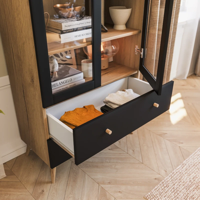 Górna część witryny wyposażona jest w dwuskrzydłowe drzwi z szybami, które nie tylko dodają lekkości całej konstrukcji, ale również umożliwiają subtelne wyeksponowanie ulubionych książek, pięknej porcelany czy dekoracji. Szklane fronty wprowadzają do wnętrza delikatny akcent, jednocześnie chroniąc przechowywane przedmioty przed kurzem. Drzwi wyposażone w zawiasy z cichym domykiem, zapobiegają trzaskaniu.