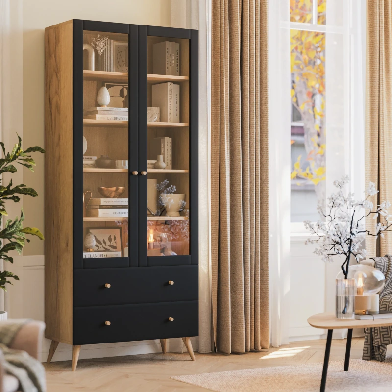 Wysoka witryna na nóżkach - funkcjonalność w stylu modern i skandi