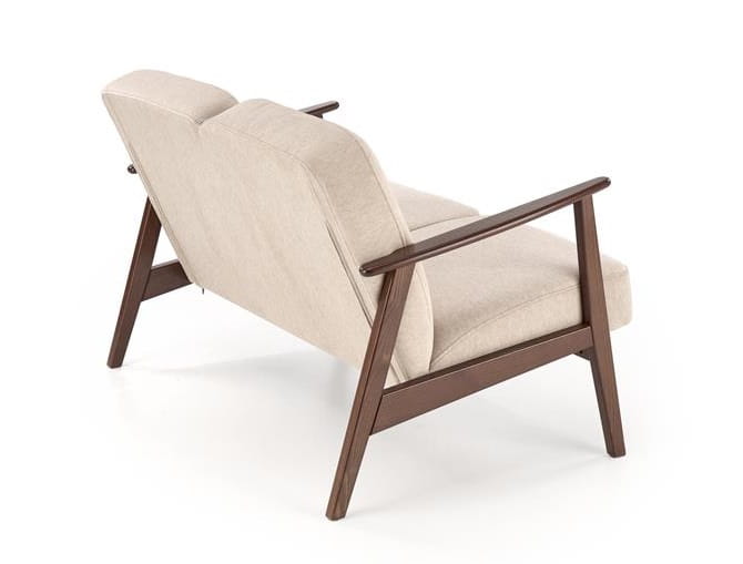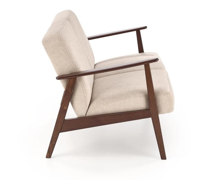 Sofa retro FOX II to fantastyczne rozwiązanie do kameralnych wnętrz, gdzie liczy się zarówno wysoka estetyka, jak i komfort użytkowania. Jej komfortowa tapicerka wykonana z wysokiej jakości tkaniny CASTEL w kolorze beżowym harmonijnie koresponduje z drewnianymi, bukowymi nóżkami w odcieniu ciemnego orzecha, tworząc wyrafinowaną, a przy tym subtelną kompozycję.