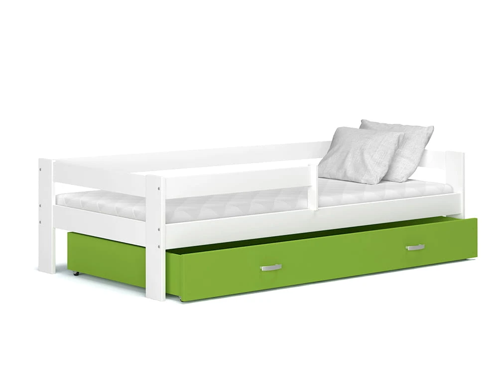 - Łóżko zawiera pojemną i wysuwaną szufladę na kółkach, bezpieczną barierkę oraz materac piankowy 80x160 cm