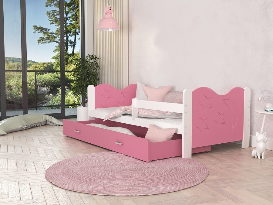 Łóżko dziecięce wyposażone w wysuwaną i pojemną szufladę na kółkach daje możliwość przechowywania pościeli i akcesoriów do spania jak np. koce, poduszki, zabawki. To istotne, szczególnie, ze dzieci traktują łóżka nie tylko jako miejsce wypoczynku, ale i przestrzeń do zabawy. Jakość wykonania, funkcjonalność i wzornictwo świetnie ze sobą współgrają.