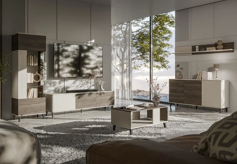 Jeśli szukasz komody na ubrania, która jednocześnie pełni rolę mebla salonowego, komoda Rendo jest jednym z tych mebli, które naprawdę warto rozważyć. Nie jest to kolejna generyczna szafka, która stoi gdzieś w rogu i nic nie wnosi do aranżacji - to mebel, który od razu widać i który od razu budzi zainteresowanie. Powodem jest przede wszystkim zestawienie kolorów: kaszmir z orzechem. To kombinacja, która działa na przestrzeni tak samo jak dobry projekt wnętrza - wnosi do pomieszczenia ciepło i przytulność, ale jednocześnie utrzymuje poziom klasycznej elegancji, który nie znosi się z upływem czasu.