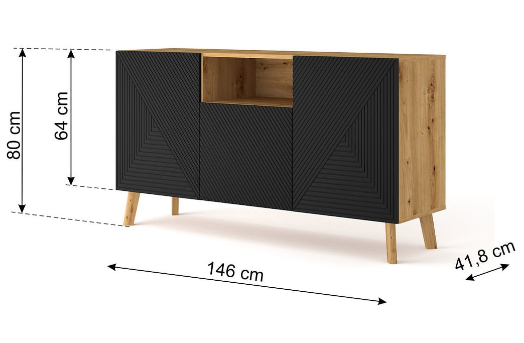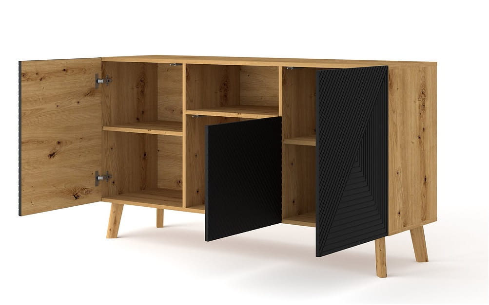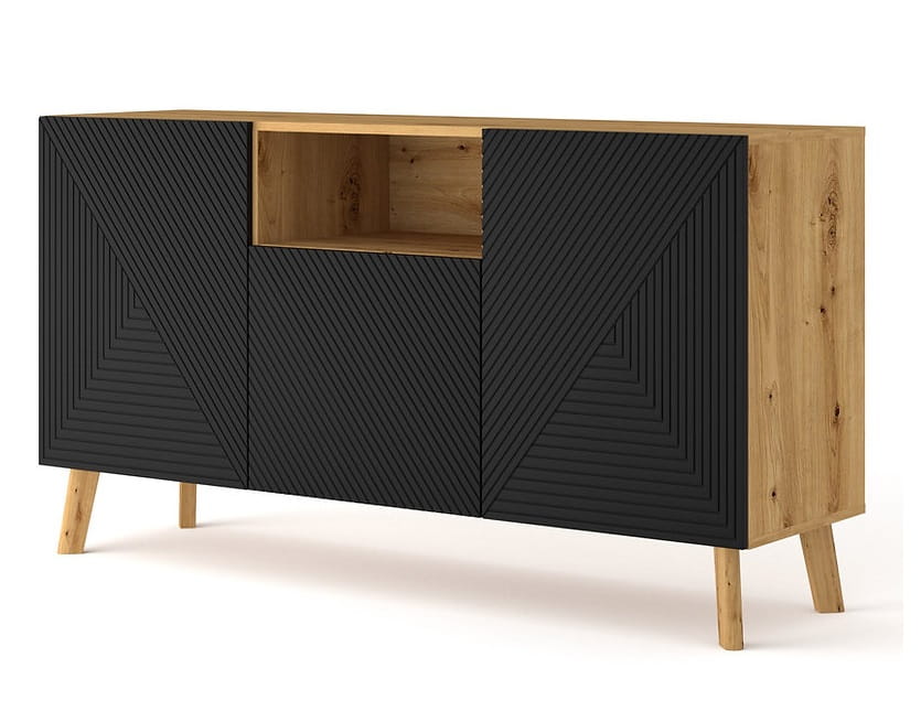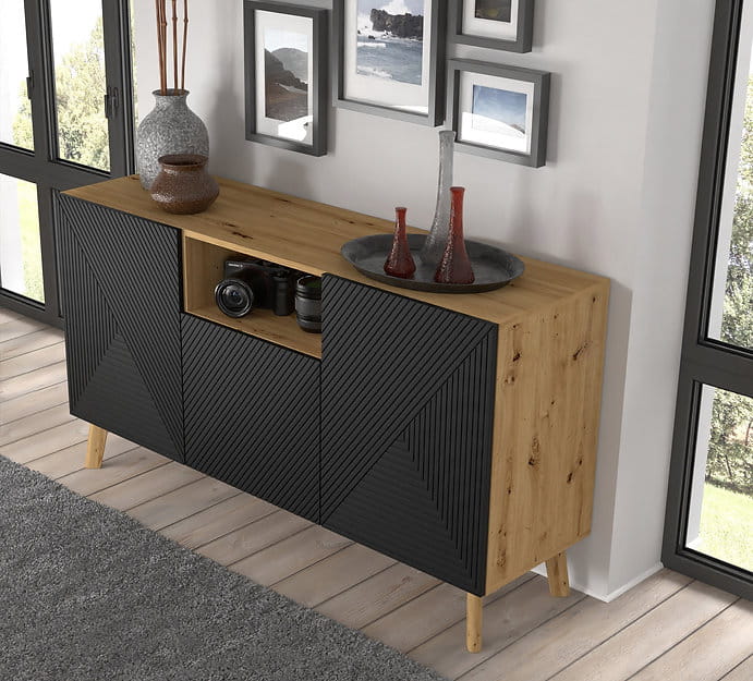 Mebel ten wykonany jest z wysokiej jakości płyty MDF, a konstrukcję posadowiono na drewnianych nóżkach. Nasza komoda ma piękny, elegancki dekor, gdzie matową czerń połączono z kolorem dębu artisan. Kontrast ten nadaje jej wytworności.