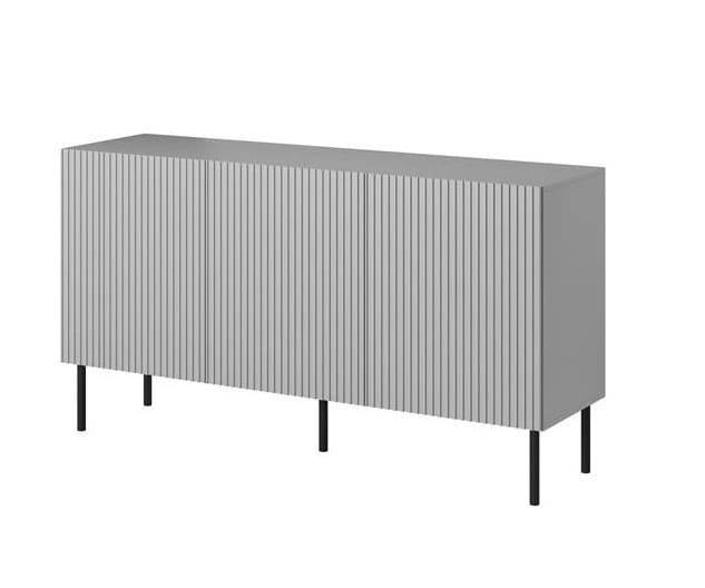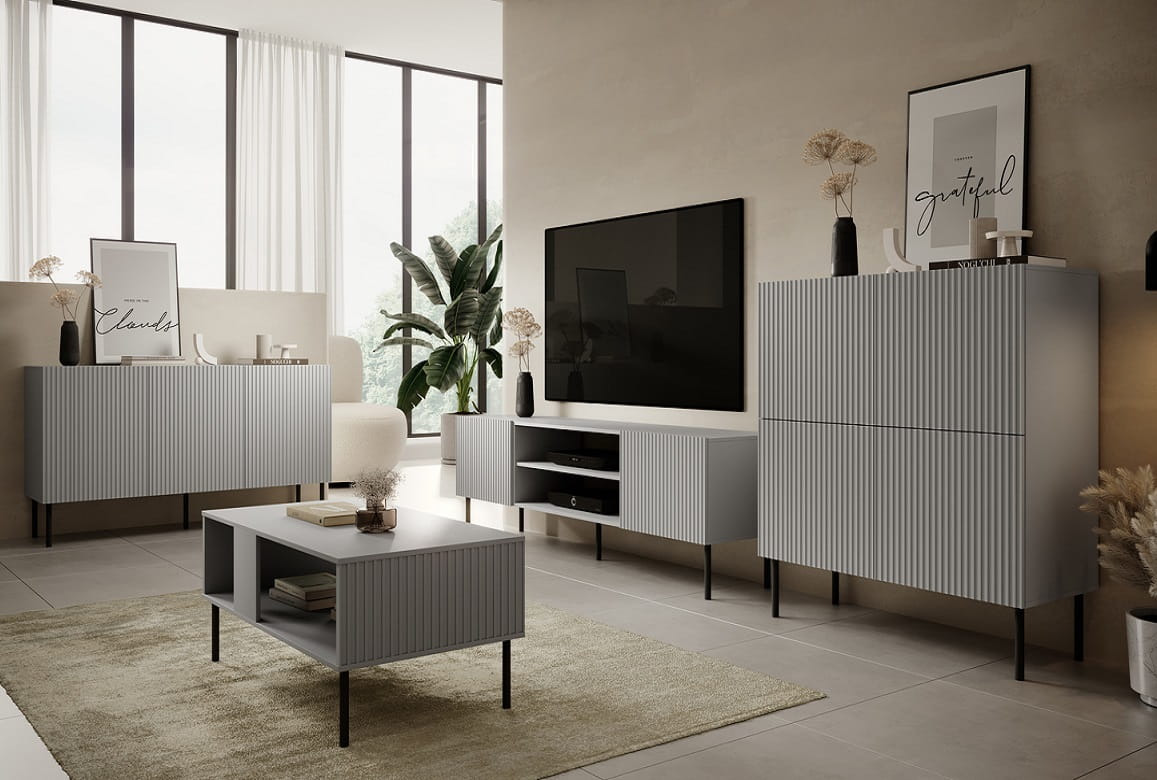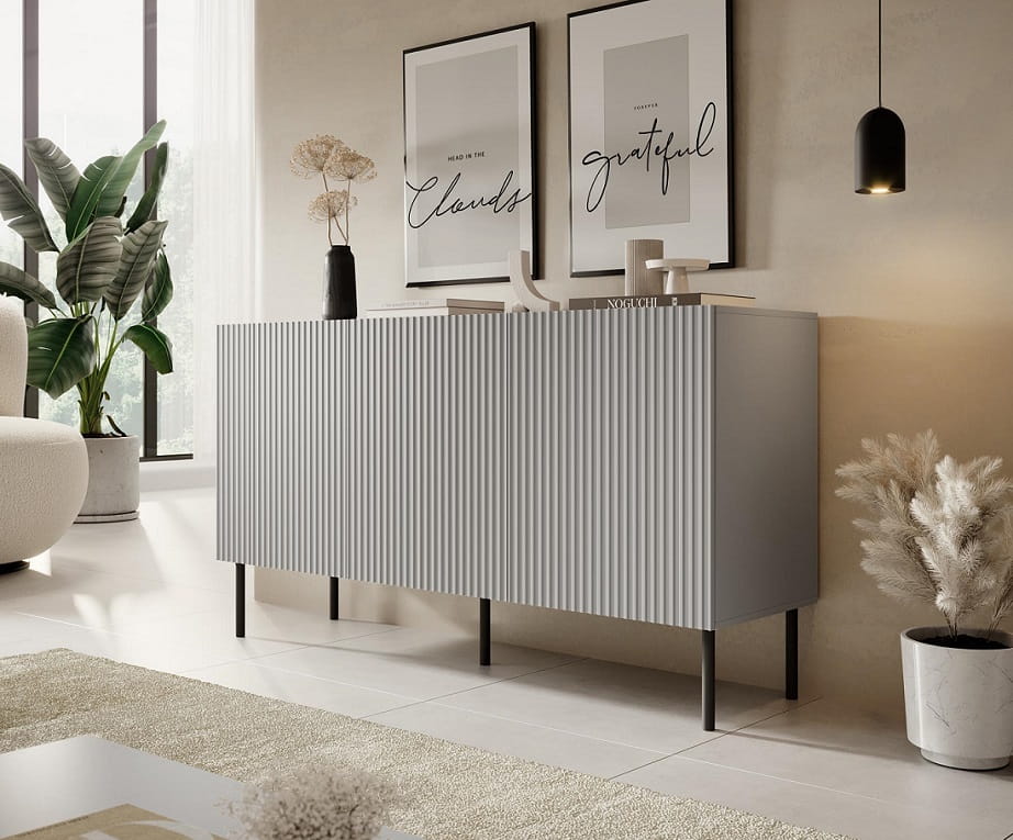 Wobec najnowszych trendów wnętrzarskich prezentujemy Państwu minimalistyczny mebel do salonu lub gabinetu jakim jest komoda ryflowana z kolekcji Kioto. Model ten nie tylko podąża za modą, ale również definiuje współczesny wymiar elegancji i funkcjonalności we wnętrzu. Kolor popielaty, będący kwintesencją ponadczasowej estetyki, doskonale współgra z modnymi ryflami na frontach, tworząc unikalny mebel, który z pewnością przyciągnie uwagę.