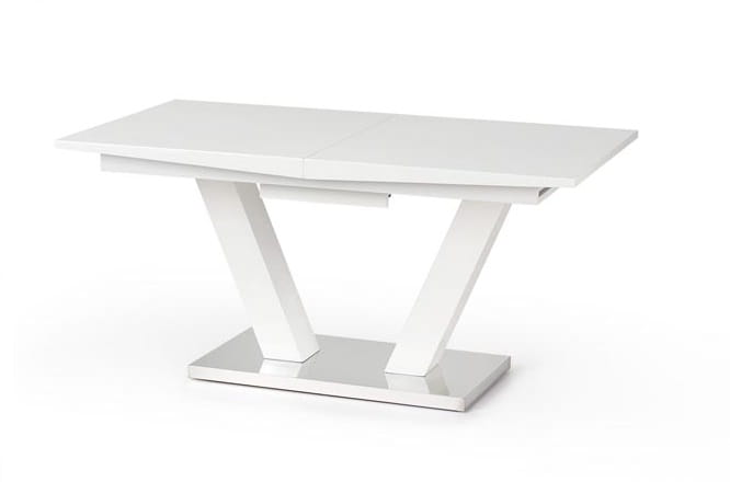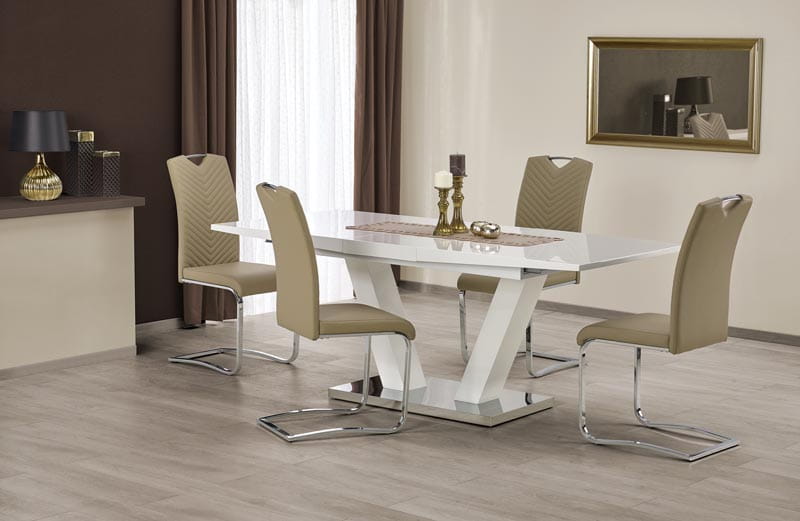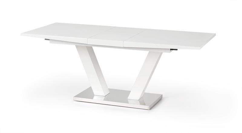 Elegancki stół o silnej formie - silnie determinuje jego charakter. Na uwagę zasługuje stabilna podstawa konstrukcji ze stali nierdzewnej, wytworna, nowoczesna forma, a także nieszablonowa kolorystka, gdzie łączy się biel z metalową srebrną podstawą. Blat wykonany z pięknej, lakierowanej płyty MDF, co sprawia, że świetnie się prezentuje. Jednocześnie łatwo jest utrzymać go w nieskazitelnej czystości.