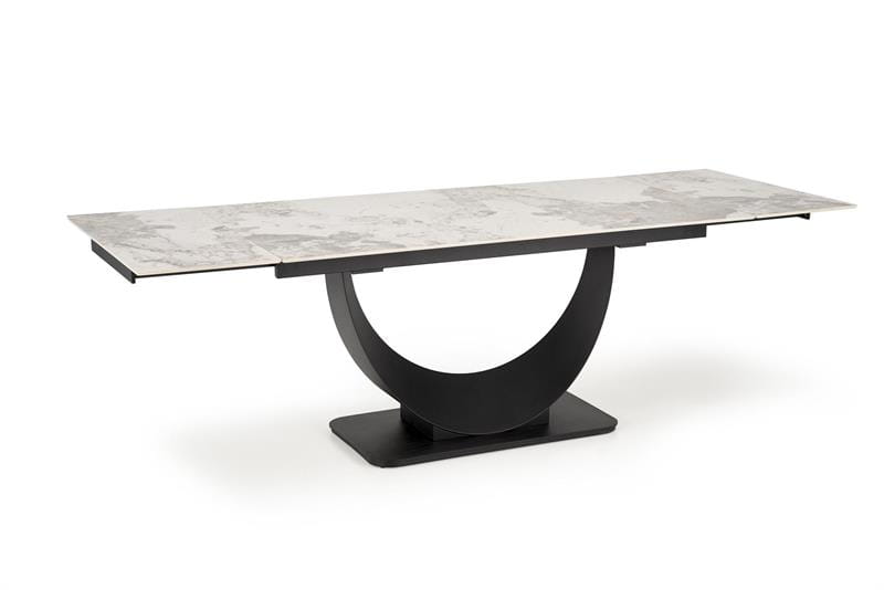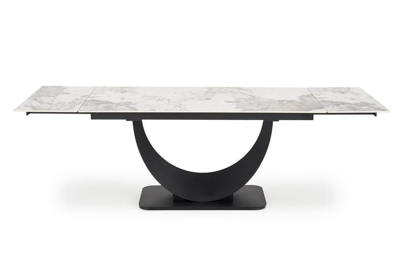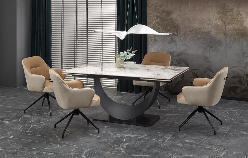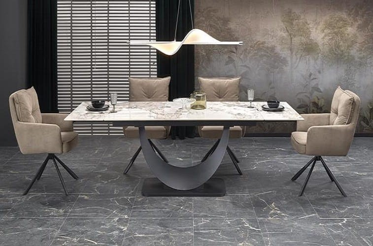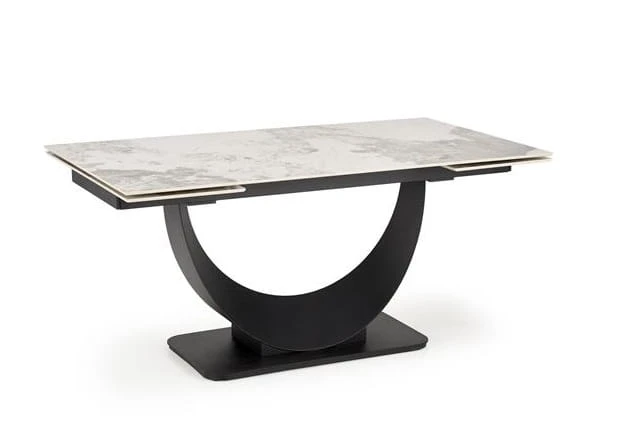 Rozkładany blat stołu Ginno wykonany jest ze spieku, który wiernie imituje biały marmur. Ta elegancka powierzchnia nie tylko zachwyca swoim wyglądem, ale również zapewnia wyjątkową trwałość i łatwość w utrzymaniu czystości. Kombinacja bieli marmuru i głębokiej czerni sprawia, że stół ten to nie tylko mebel, lecz prawdziwe dzieło sztuki, które przyciąga wzrok i dodaje elegancji całemu otoczeniu.