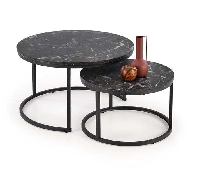 Nasze okrągłe stoliki kawowe Delay są perfekcyjne do przyjmowania gości. Dzięki dużym blatom, bez problemu ustawisz filiżanki z kawą, talerzyki z ciastem i inne przekąski. Okrągły kształt blatu sprawia, że stoliki są niezwykle praktyczne i wygodne w użyciu, pozwalając na swobodne rozmieszczenie przedmiotów. Poza tym doskonale pasują do różnych stylów wnętrzarskich – nowoczesnych, loftowych, glamour. Czarny marmur i czarne metalowe stelaże nadają wnętrzu luksusowy wygląd. Idealnie pasują do małych przestrzeni dzięki możliwości schowania mniejszego stolika pod większy, co pozwala zaoszczędzić miejsce.