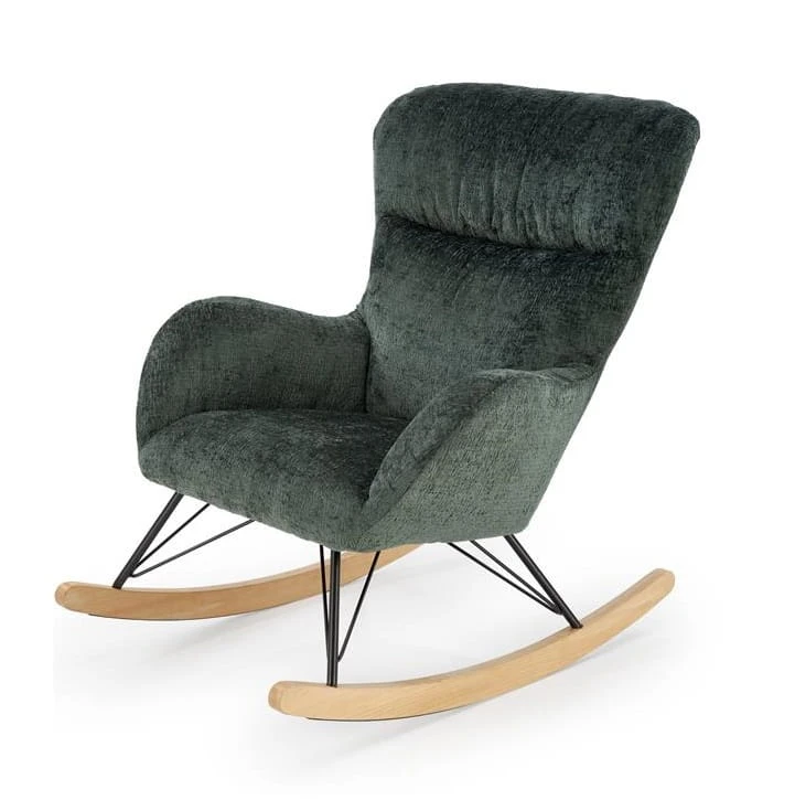 Zanurz się w komfortowym relaksie z naszym nowoczesnym fotelem bujanym z wysokim oparciem. Ten elegancki fotel na biegunach to idealny dodatek do Twojego salonu, sypialni czy pokoju dziennego. Dzięki wysokiemu oparciu łączonemu z ergonomicznie zaprojektowanymi podłokietnikami, nasz fotel Cassy zapewnia niezrównany komfort podczas długich sesji relaksacyjnych. Wygodne siedzisko tapicerowane miłą w dotyku tkaniną w kolorze zielonym zapewni Ci nie tylko wygodę, ale także elegancki wygląd.