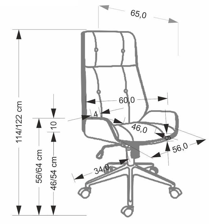 - Wymiary: szerokość - 60 cm, głębokość - 65 cm, wysokość - 114÷122 cm, wysokość siedziska - 46÷54 cm