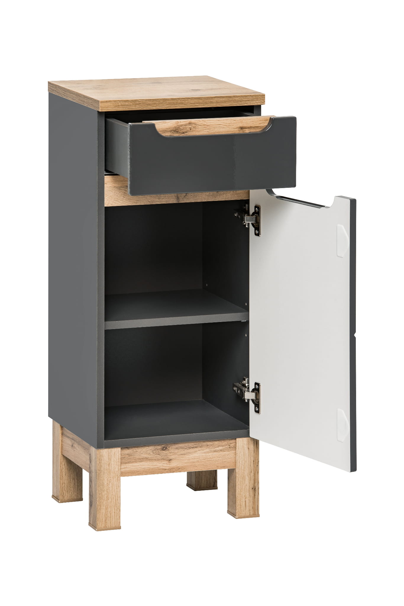 Meble do łazienki z kolekcji Amber to zestaw, na który składa się: słupek wysoki, słupek niski, szafka wisząca, szafka z lustrem i szafka z umywalką. Piękne, stylowe fronty w grafitowym kolorze nadadzą pomieszczeniu świeżości. Meble wzbogacone o drewnopodobne komponenty nawiązują do nurtu scandi, ściśle związanego z naturą. Zestaw wykonany jest z najwyższą starannością, a dodatkowo wyróżnia go nowoczesny system cichego zamykania. Szafki opierają się na nóżkach, dzięki czemu wilgoć nie będzie kumulować się pod meblami, ułatwi to również sprzątanie pokoju kąpielowego.
