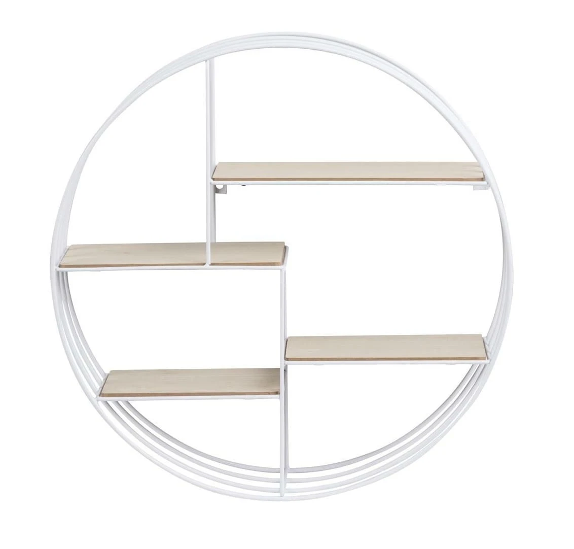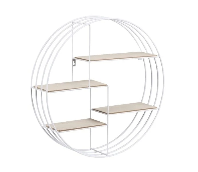 Okrągła półka ścienna Venus stworzona jest z metalu malowanego proszkowo na kolor biały i z naturalnego drewna paulownia. Ma ona niecodzienną formę, dlatego wzbogaci każde wnętrze! Zarówno nowoczesny salon, jak i pokój nastolatka! Model ten, okrągły, sam w sobie jest niebanalną ozdobą, która to do Państwa dyspozycji zapewnia aż cztery drewniane półeczki. To właśnie na nich można umieścić ulubione drobiazgi, a nawet kwiaty, które jeszcze dodadzą temu akcesorium uroku.