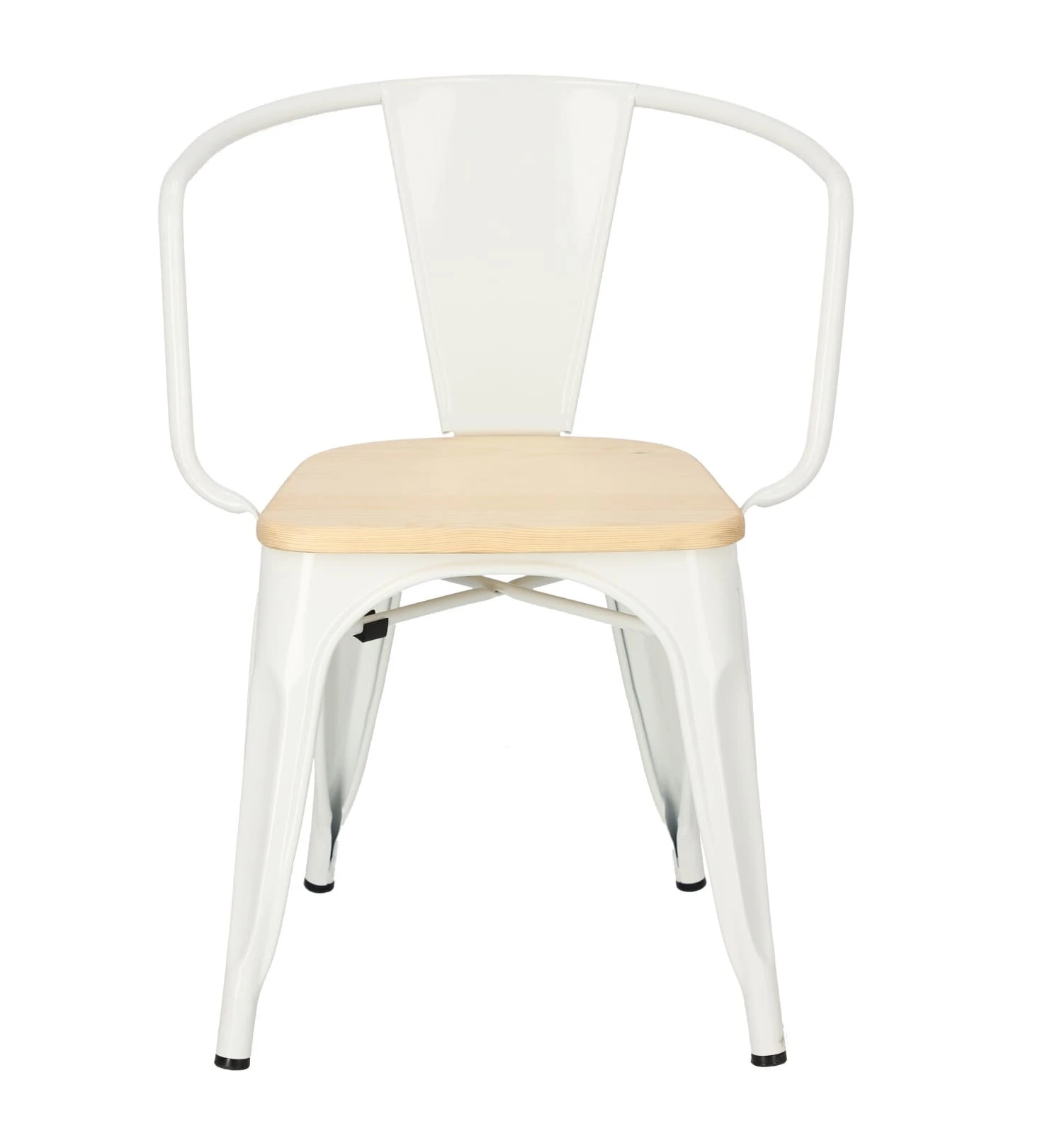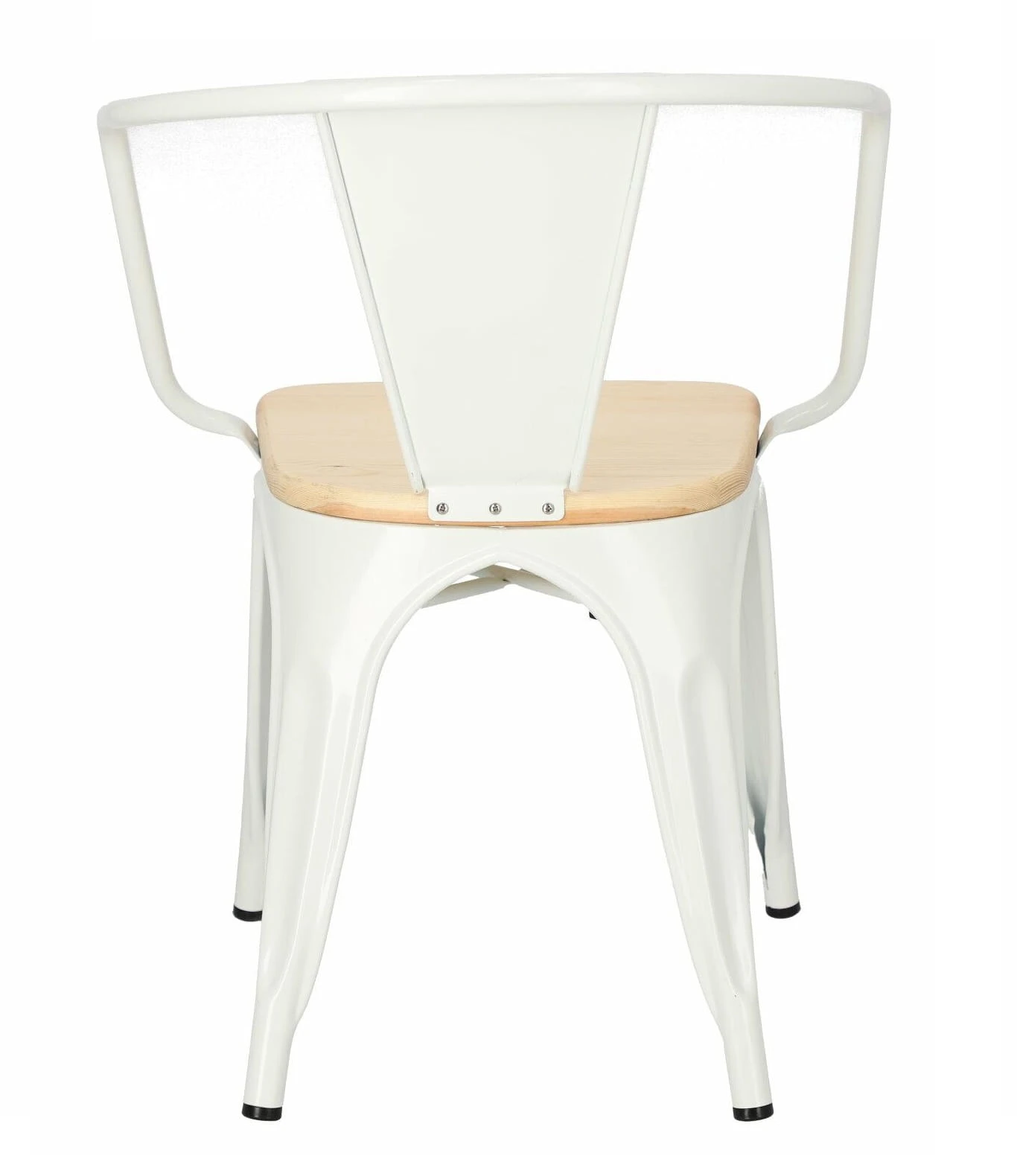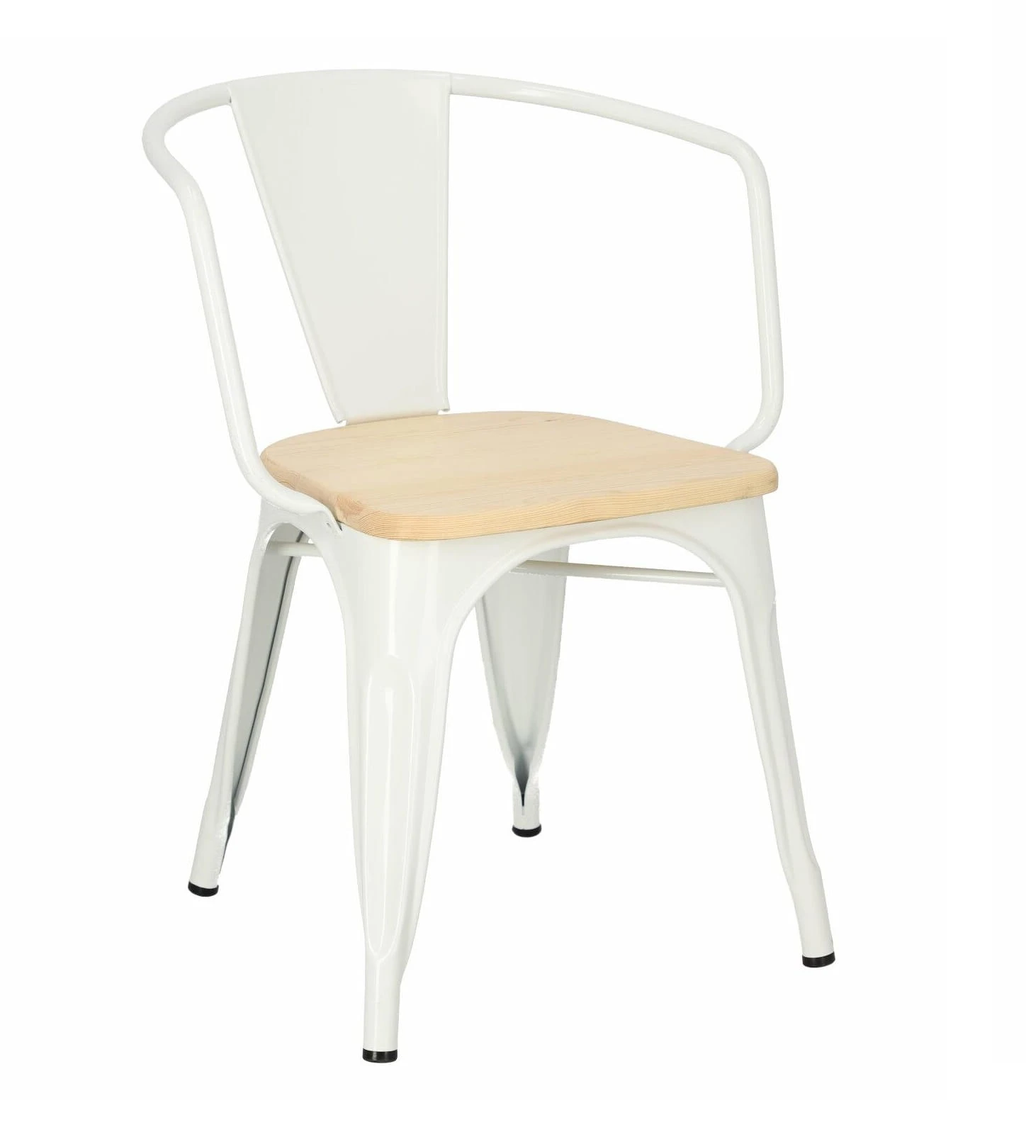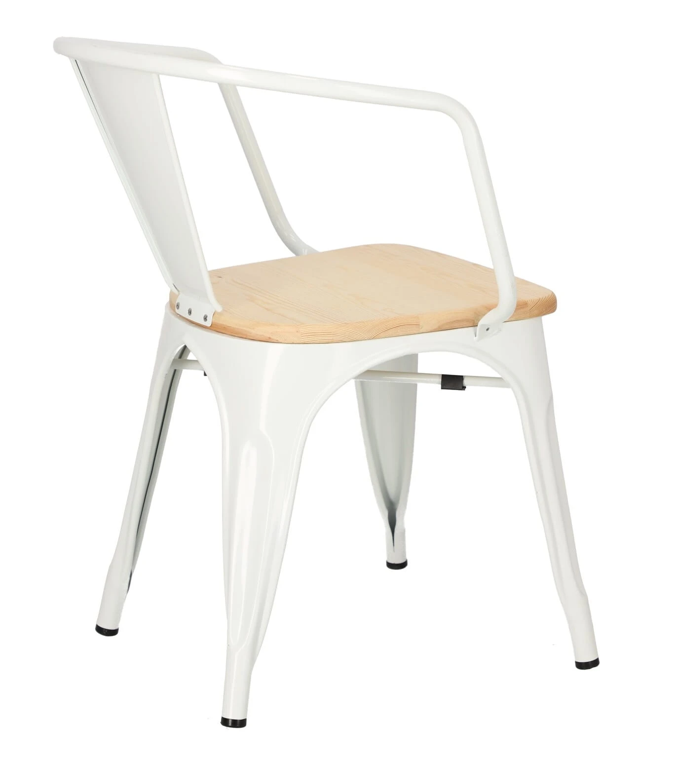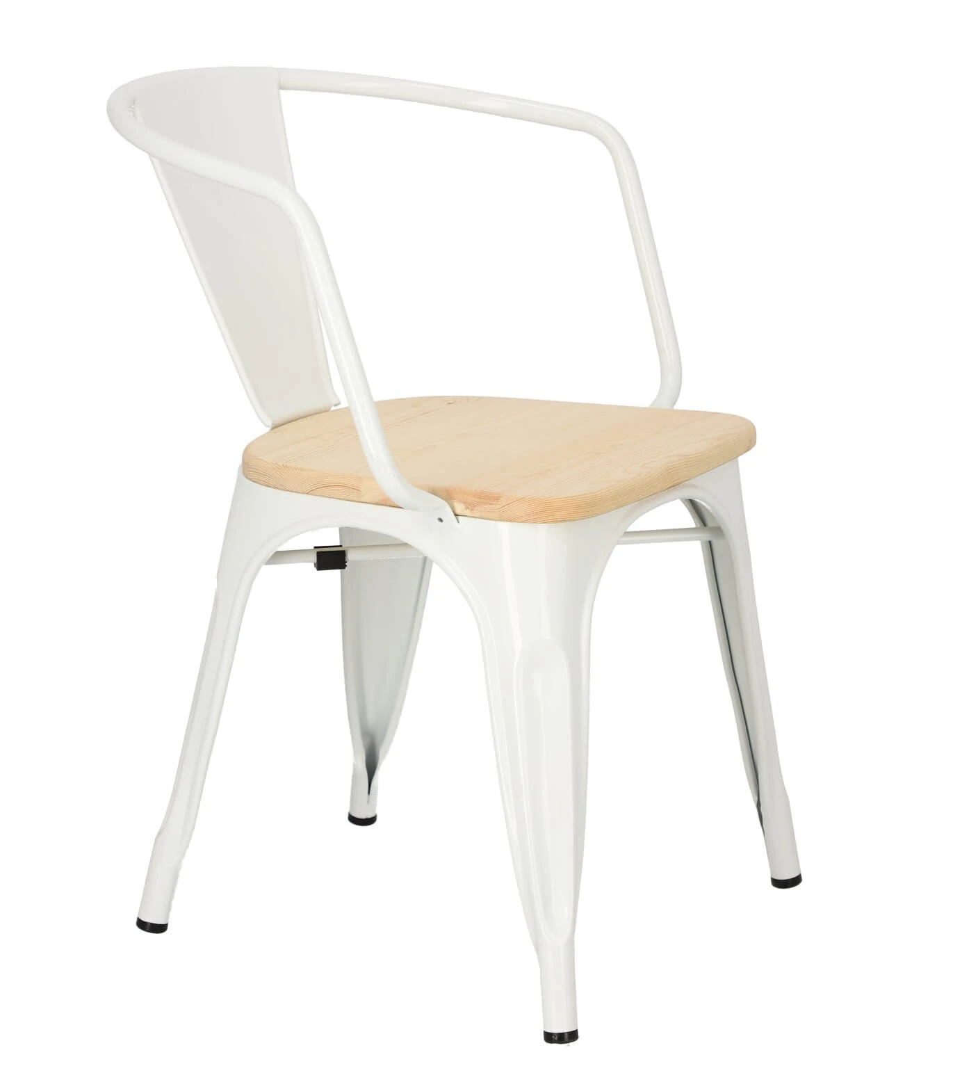 Industrialne białe krzesło metalowe z drewnianym siedziskiem