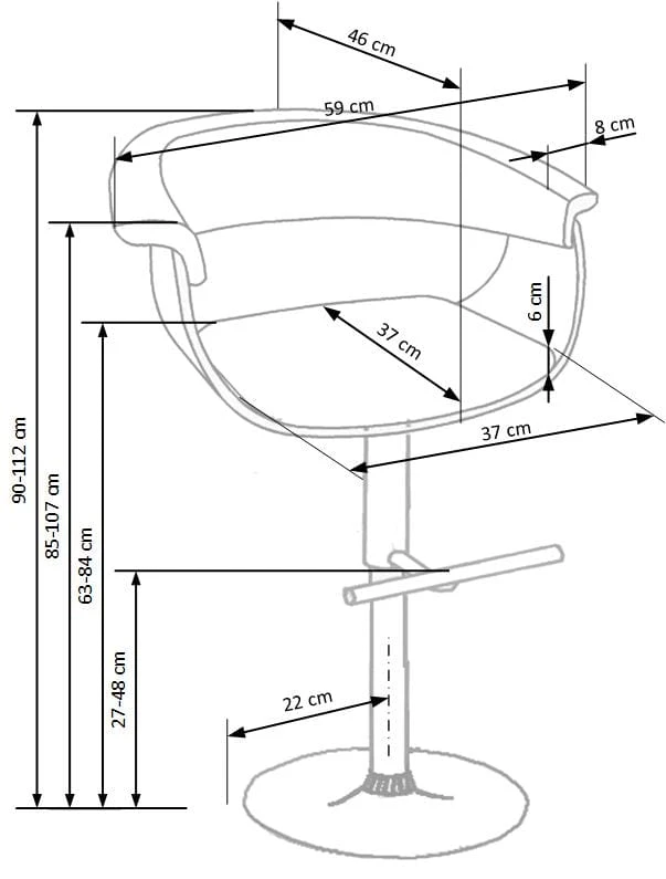 - Wymiary: szerokość siedziska - 59 cm, głębokość siedziska - 46 cm, wysokość hokera - 90÷112 cm