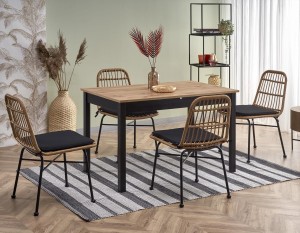 Już sam jego kolor wskazuje, że mebel ten nie należy do przeciętnych. Jednak prostokątny stół do salonu lub do gustownej jadalni odkrywa więcej kart, które świadczą o jego luksusowej formie. Osadzony jest on bowiem na zgrabnych nogach z płyty meblowej, których czarne, kontrastujące wykończenie u podstawy nadaje temu meblowi prawdziwego sznytu! Blat imitujący strukturę drewna o naturalnym usłojeniu to już prawdziwa "kropka nad i".