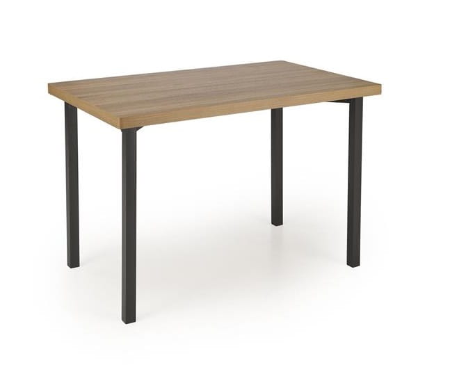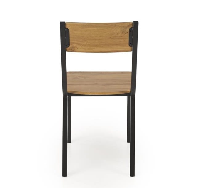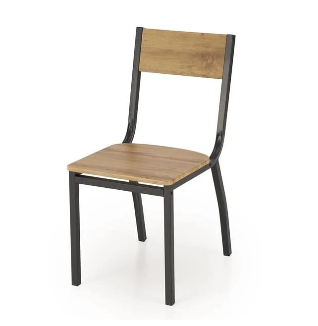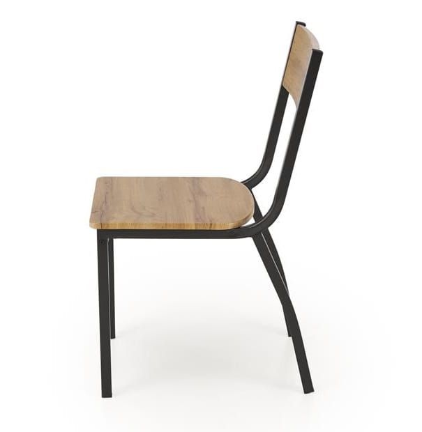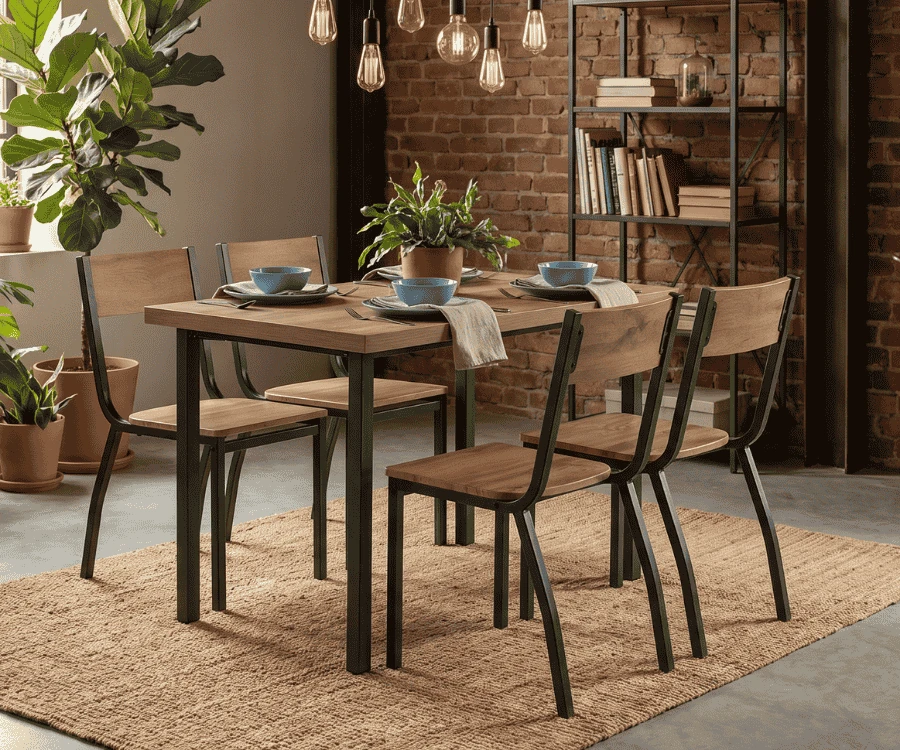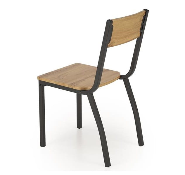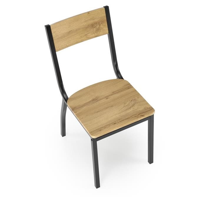 Blat stołu i siedziska krzeseł wykonane są z płyty meblowej okleinowanej w naturalnym kolorze, który dodaje ciepła i przytulności każdej nowoczesnej kuchni. Dzięki temu, miejsce to staje się sercem przestrzeni dedykowanej spożywaniu posiłków. Naturalne wykończenie doskonale kontrastuje z industrialnym stylem stalowego stelaża, tworząc spójną i estetyczną całość.