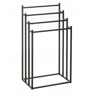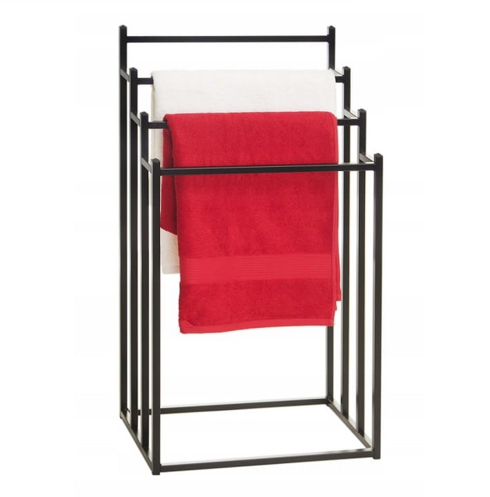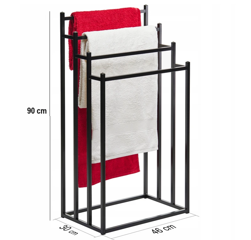 Stojak loftowy na ręczniki wykonany jest ze stali pomalowanej farbą za pomocą techniki proszkowej. Stal zabezpieczona w ten sposób jest bardzo wytrzymała, odporna na korozję i dobrze wpisuje się w trend industrialny. Ponieważ materiał ten jest wodoodporny, doskonale nadaje się do stosowania w wilgotnych pomieszczeniach, takich jak łazienka. Stojak loftowy na ręczniki posiada nowoczesny design, a dzięki czarnemu kolorowi pasuje do niemal każdego stylu wnętrza i doskonale prezentuje się nawet w niewielkich przestrzeniach.