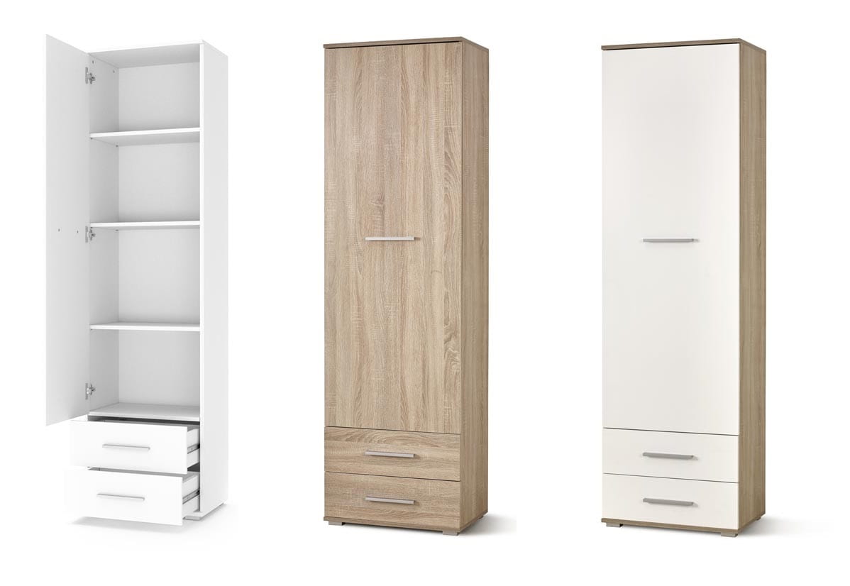 Wąska szafa z półkami z serii Kris to niebagatelna powierzchnia do zagospodarowania! Zmieści się w niej cała garderoba! Posiada bowiem funkcjonalne półki, a także szuflady. Na praktycznych półkach można segregować i układać ubrania, w szufladach zaś bieliznę oraz akcesoria. Oczywiście taką szafę można umieścić także w salonie, a nawet w łazience! Tu posłuży jako miejsce do przechowywania szlafroków, ręczników łazienkowych i pościeli.