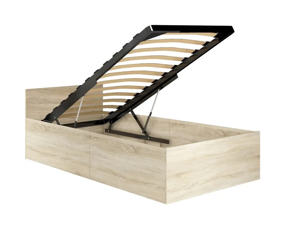 Łóżko jednoosobowe Amato stworzone zostało jako wyposażenie niewielkiej sypialni lub pokoju młodzieżowego. To stabilny i wytrzymały mebel wykonany z wysokiej jakości płyty meblowej, zaopatrzony w podnoszony stelaż z płaskich, odpowiednio uformowanych brzozowych listew. Łóżko jednoosobowe Amato posiada również obszerny, funkcjonalny pojemnik na pościel, który sprzyja dobremu zagospodarowaniu przestrzeni w pomieszczeniu. Dzięki niemu mebel będzie służyć nie tylko do spania, ale też jako miejsce na przechowywanie poduszek, kołdry czy ciepłych koców. Wystarczy unieść drewniany stelaż, co dzięki sprawnie działającym gazowym siłownikom zrobimy dosłownie jedną ręką, by mieścić zbędne rzeczy.