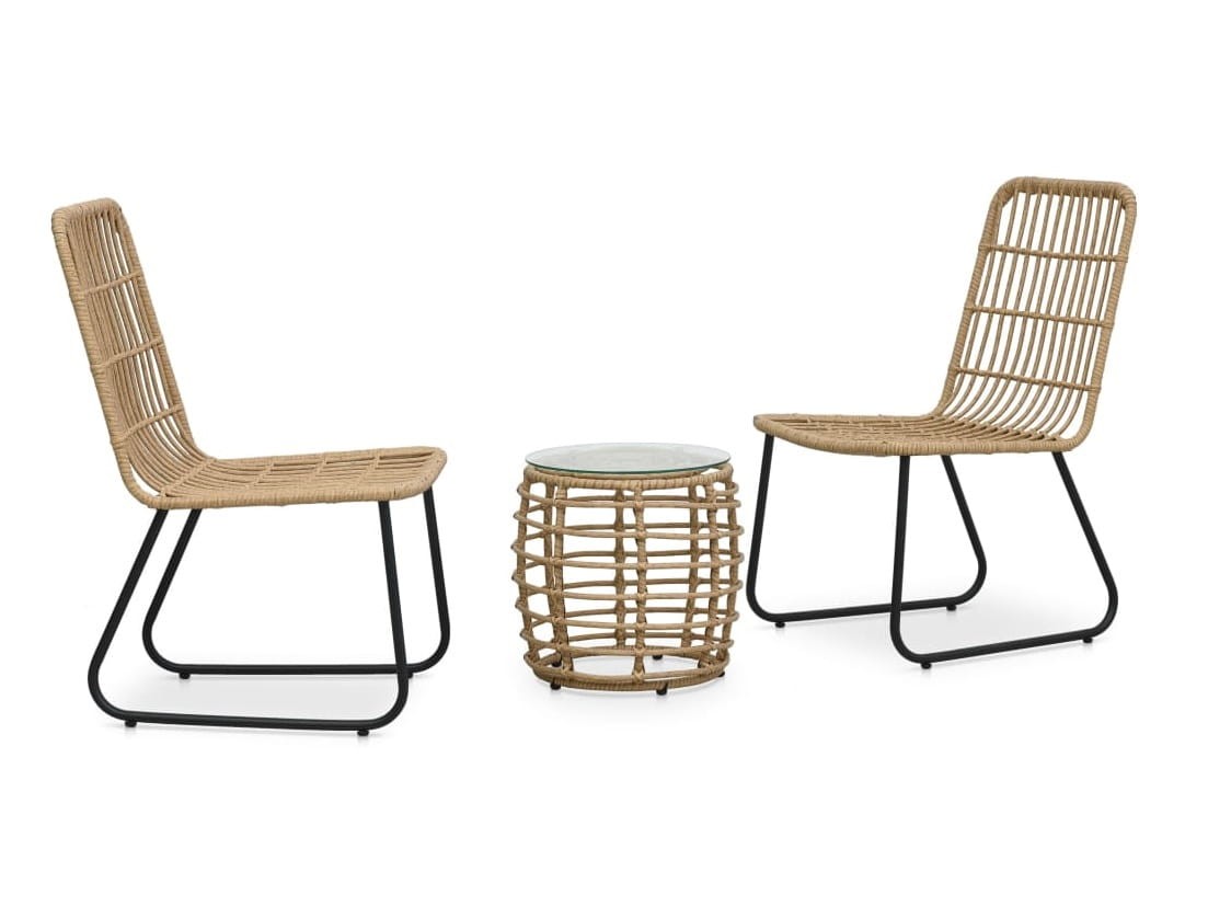 Zestaw mebli do ogrodu Polly składa się z trzech odrębnych elementów. Są to dwa wygodne fotele/krzesła ogrodowe i okrągły stolik kawowy. Komplet stworzono inspirując się naturalnym rattanem. Zakładając jednak, że trafi on do ogrodu, na taras, balkon lub działkę pod chmurką – wykorzystano inspirowany tym kultowym materiałem polirattan. Wykazuje się on niezwykle wysoką odpornością na niesprzyjające warunki atmosferyczne, a to dzięki zawartości syntetycznej żywicy, na którą składają się wzmocnione włókna polietylenowego HPDE. Rattan PE nie poddaje się również rdzy czy pleśni.