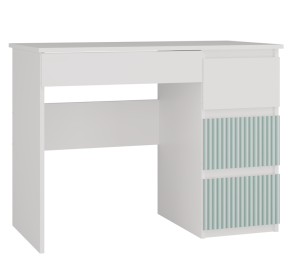 Gładkie boki bez zaślepek i fronty bez uchwytów nadają biurku nowoczesny wygląd, który doskonale wpisuje się w współczesne trendy aranżacyjne. Dzięki trzem szufladom, z których dwie ozdobione są miętowym nadrukiem, masz miejsce na schowanie wszystkich niezbędnych rzeczy. Szuflada pod blatem biurka jest idealnym miejscem do przechowywania akcesoriów do pisania, takich jak długopisy, ołówki, gumki do mazania czy temperówki. Dzięki temu wszystkie niezbędne przedmioty są zawsze pod ręką podczas pracy lub nauki. Posiadanie szuflad pod blatem pozwala na wykorzystanie przestrzeni biurka w sposób efektywny, co zwiększa dostępną powierzchnię roboczą i ułatwia wykonywanie zadań.