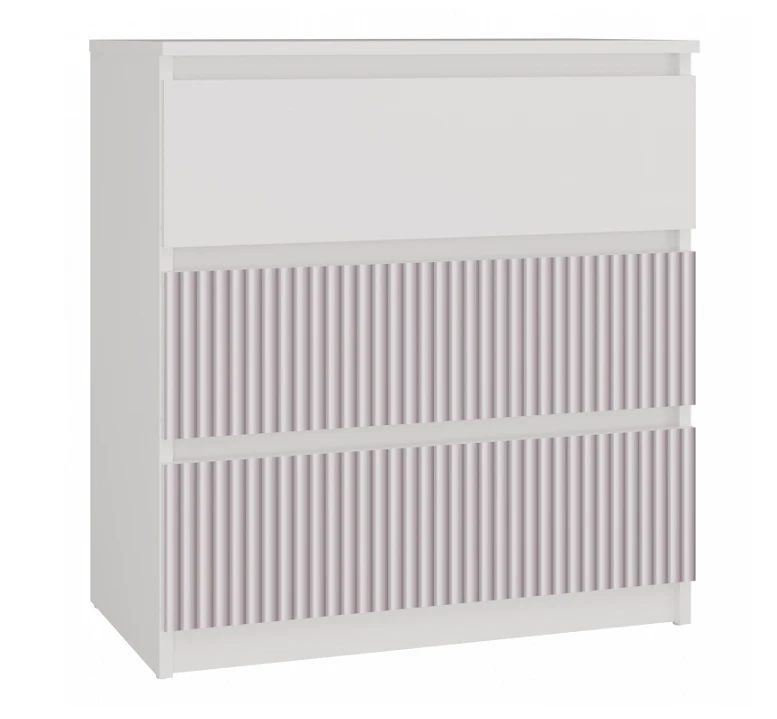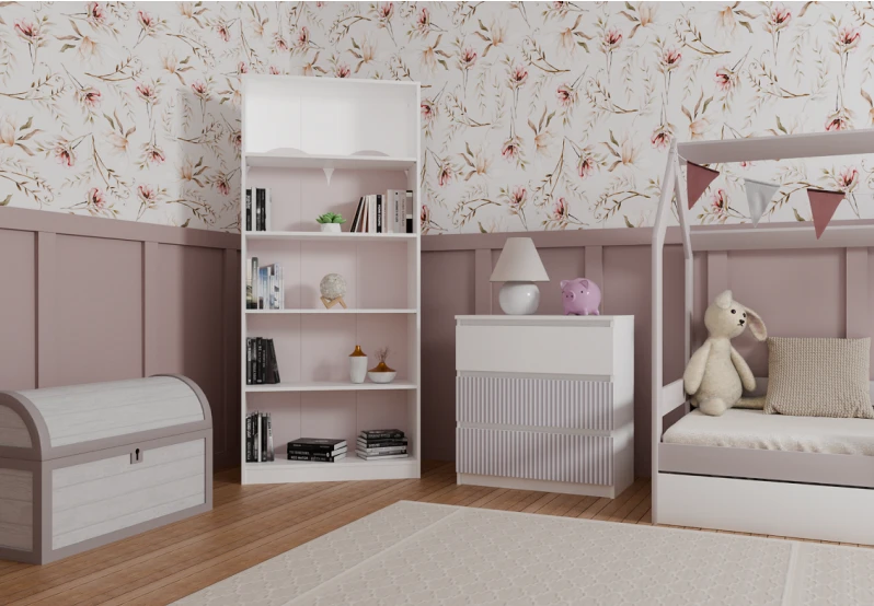 Front dwóch dolnych szuflad naszej komody ozdobiony jest pionowymi wzorami w kolorze różowym, nadrukowanymi w nowoczesnej technologii, co nadaje meblowi wyjątkowego charakteru i dziecięcego uroku. Jakość wykonania stoi na najwyższym poziomie, co gwarantuje trwałość i wytrzymałość mebla przez wiele lat. Nowy typ okuć oraz gładkie boki bez zaślepek to kolejne atuty naszej komody, które sprawiają, że prezentuje się ona niezwykle elegancko i nowocześnie. To nie tylko praktyczny mebel, ale także atrakcyjny element dekoracyjny, który doda uroku każdemu wnętrzu.