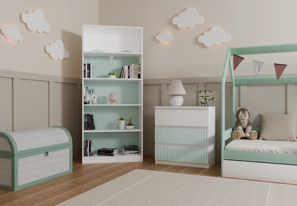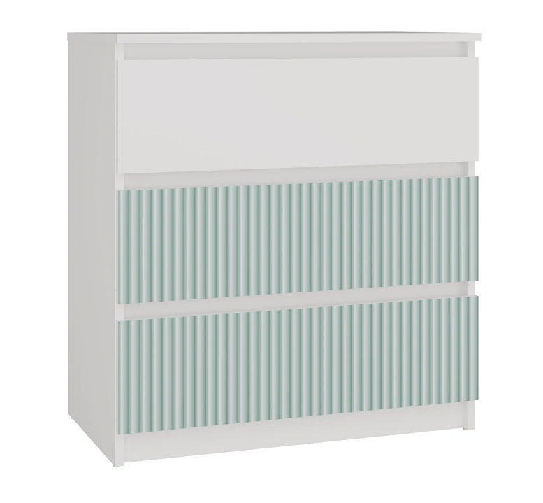 Front dwóch dolnych szuflad naszej komody ozdobiony jest pionowymi wzorami w kolorze miętowym, nadrukowanymi w nowoczesnej technologii, co nadaje meblowi wyjątkowego charakteru i dziecięcego uroku. Jakość wykonania stoi na najwyższym poziomie, co gwarantuje trwałość i wytrzymałość mebla przez wiele lat. Nowy typ okuć oraz gładkie boki bez zaślepek to kolejne atuty naszej komody, które sprawiają, że prezentuje się ona niezwykle elegancko i nowocześnie. To nie tylko praktyczny mebel, ale także atrakcyjny element dekoracyjny, który doda uroku każdemu wnętrzu.