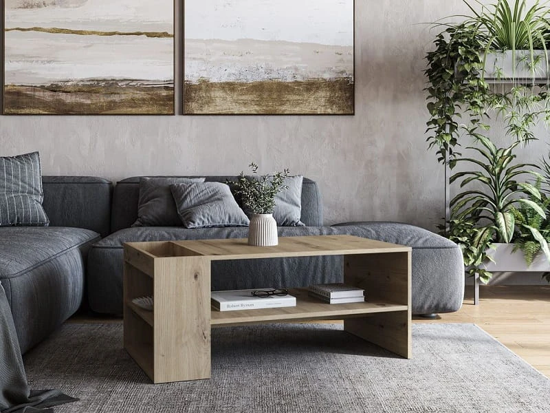 Ta ława kawowa o wymiarach 100 cm szerokości, 55 cm głębokości i 42 cm wysokości idealnie pasuje do średniej wielkości salonów, zapewniając wystarczająco dużo miejsca na filiżankę kawy, przekąski czy książkę, nie przytłaczając jednocześnie pomieszczenia. Wykonana z wysokiej jakości płyty laminowanej w ciepłym odcieniu drewna doskonale komponuje się zarówno z nowoczesnymi, jak i bardziej klasycznymi wnętrzami.