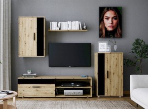 Dzięki wiszącym elementom zyskujesz dodatkową powierzchnię użytkową bez zajmowania podłogi, co wizualnie powiększa pomieszczenie i ułatwia utrzymanie porządku - możesz swobodnie odkurzyć pod meblami czy zmienić układ dywanu. Jednocześnie stojąca komoda i szafka RTV zapewniają stabilność całej kompozycji i oferują praktyczne miejsce na te przedmioty, które wolisz mieć pod ręką na wysokości ręki.