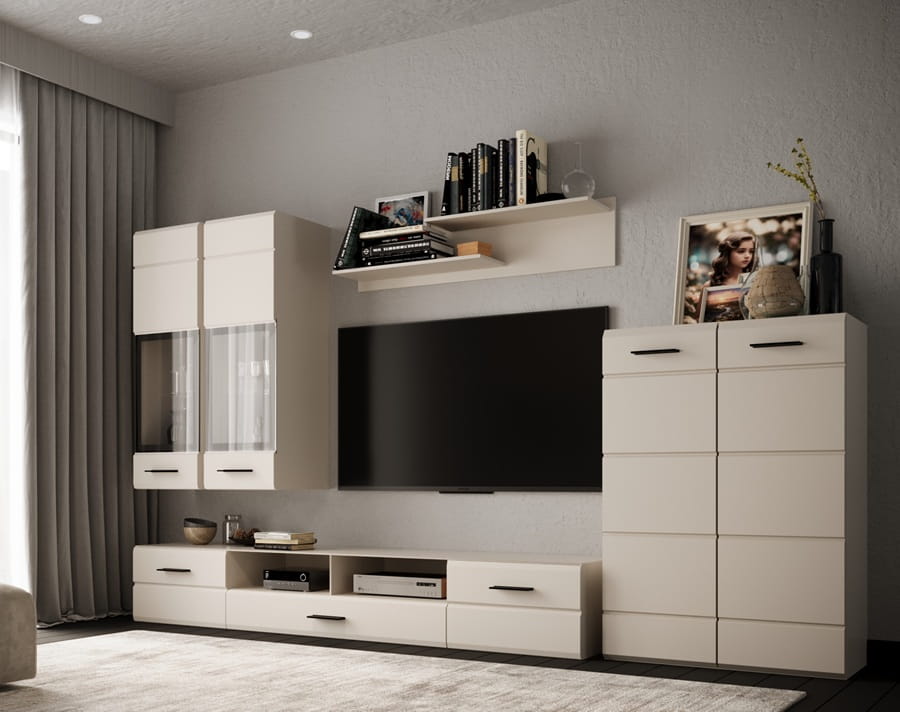 Nowoczesna meblościanka Valetti kaszmir to idealne rozwiązanie do małego salonu w bloku – daje wrażenie przestronności, wprowadza ład i harmonię, a przy tym wygląda niezwykle stylowo. To meble, które nie tylko pięknie się prezentują, ale też ułatwiają codzienne funkcjonowanie, oferując miejsce na wszystko, co chcesz mieć w zasięgu ręki.