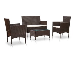 Funkcjonalny zestaw mebli z rattanu do ogrodu lub na taras to świetny wybór, głównie ze względu na trwałość materiału, z jakich jest on wykonany. Jednak poza tym - wyróżnia się on także eleganckim stylem. Brązowy kolor rattanu, a także jasne poduszki na krzesłach prezentują się znakomicie. Modne, grube siedziska poliestrowe są niezwykle komfortowe, a założone nań pokrowce można w każdej chwili zdjąć i uprać. Komplet mebli wielu aranżacjom - i tym typowo zielonym i tym tarasowym - nada charakteru! Posłuży przez wiele sezonów!