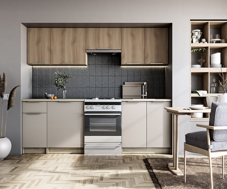 Meble kuchenne Latte to harmonijne połączenie górnych ryflowanych szafek w ciepłym odcieniu orzecha z dolnymi - w delikatnym kaszmirze. Blat w okleinie dębu sonoma fantastycznie uzupełnia całą kompozycję, tworząc harmonijną całość, która emanuje subtelnością i nowoczesnością i po prostu robi wrażenie!