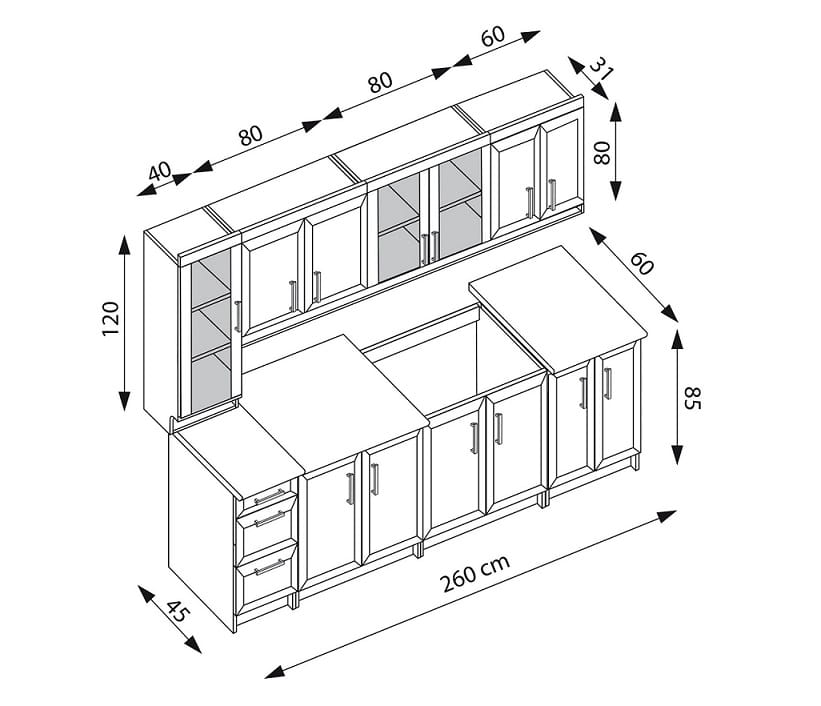 - Wymiary zestawu: długość - 260 cm, głębokość z blatem - 60 cm, grubość blatu - 28 mm