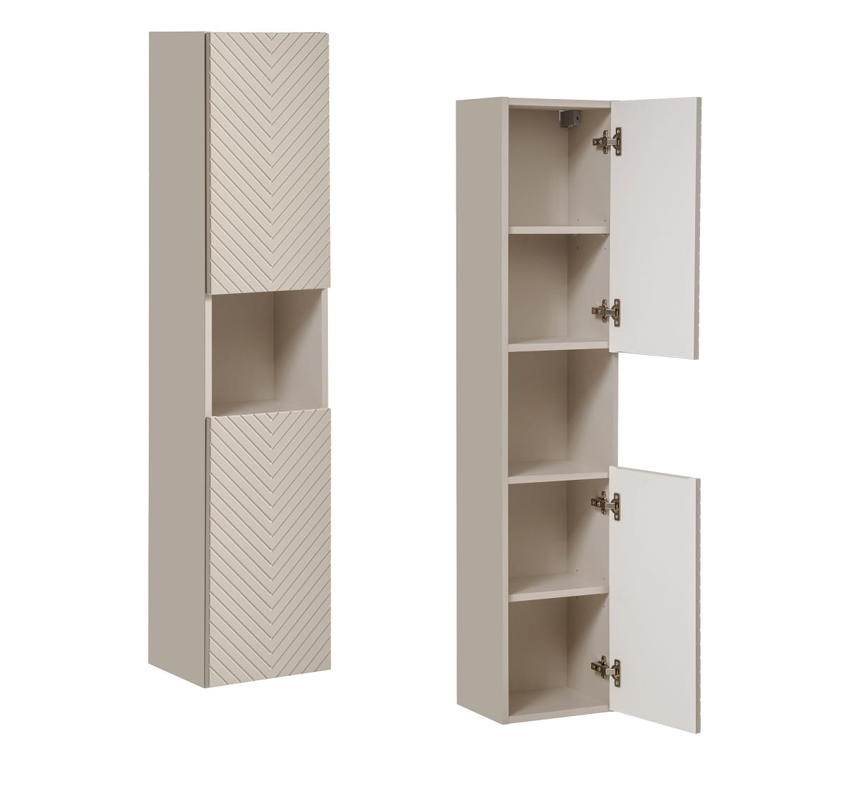 Ten wyjątkowy zestaw wiszących mebli łazienkowych zachwyca już na pierwszy rzut oka wyrafinowanym połączeniem ciepłego odcienia cashmere z ryflowanymi frontami ułożonymi w elegancką jodełkę. Geometryczny wzór w połączeniu z matowym wykończeniem nadaje meblom niepowtarzalny charakter, idealnie wpisujący się w aktualne trendy wzornicze.