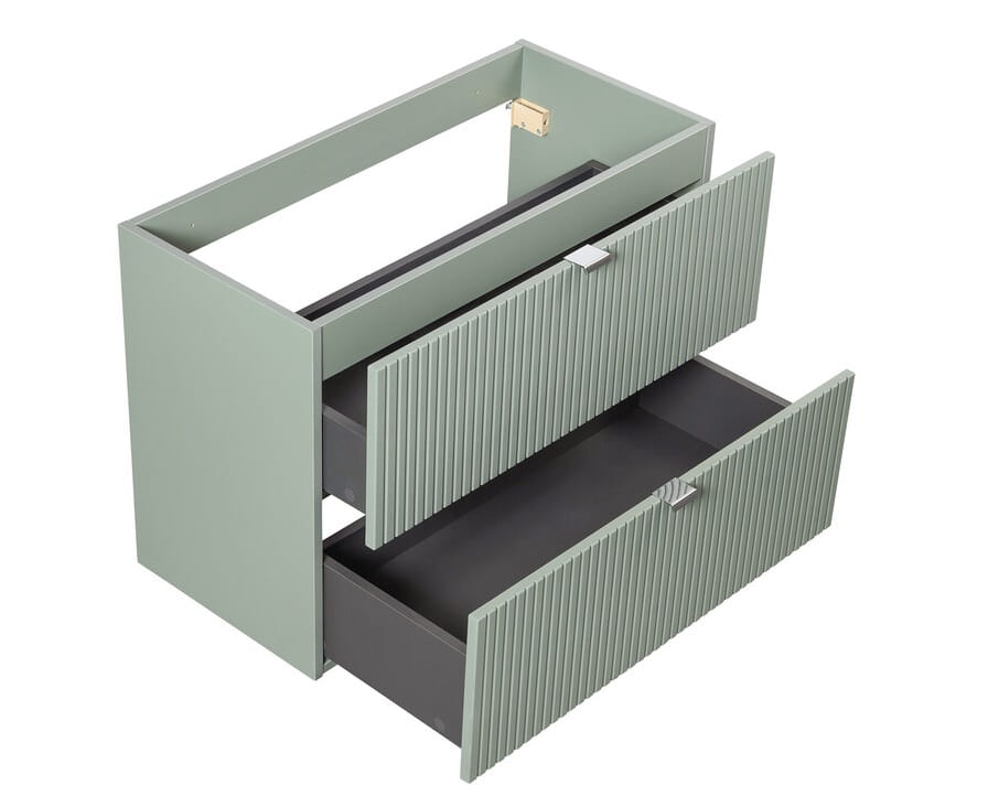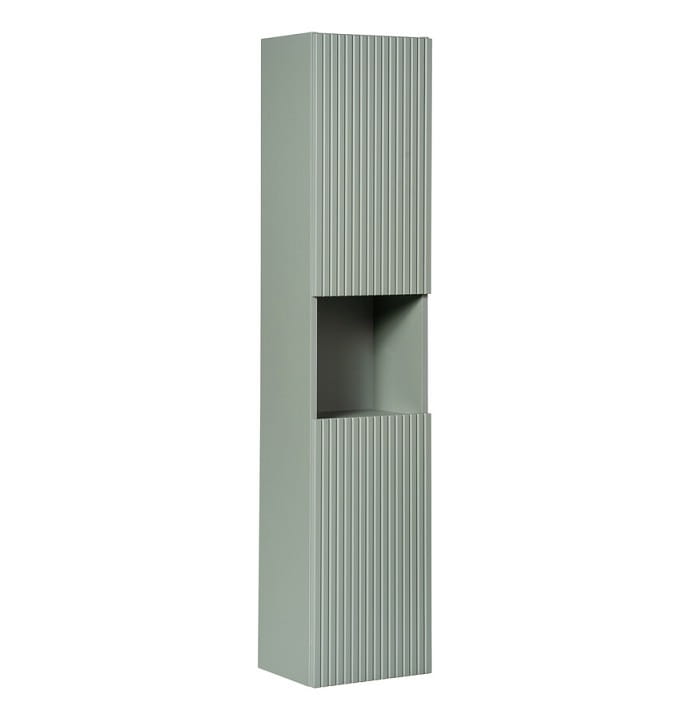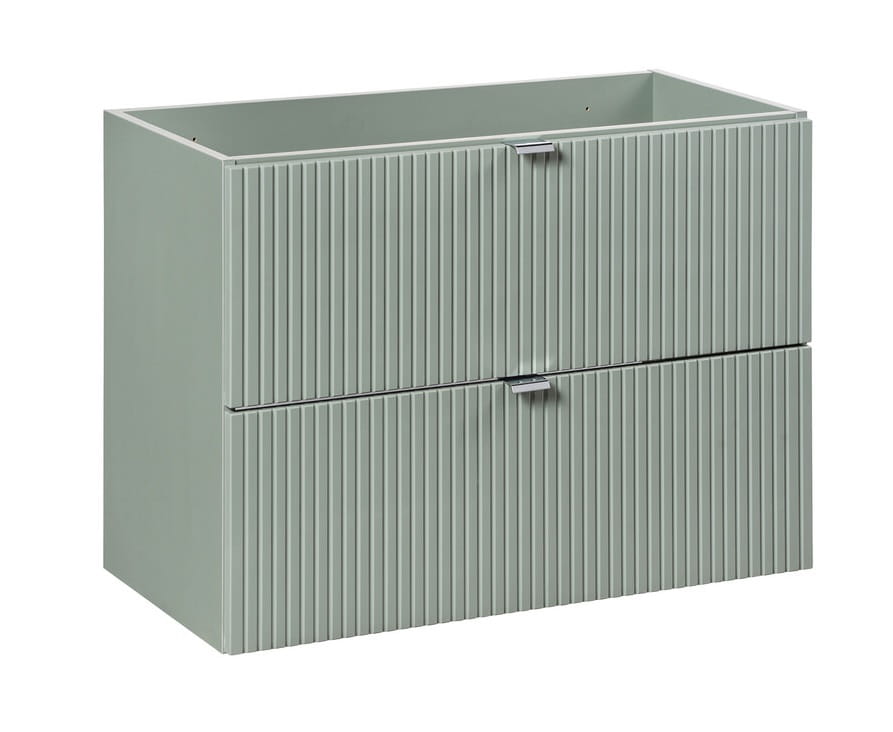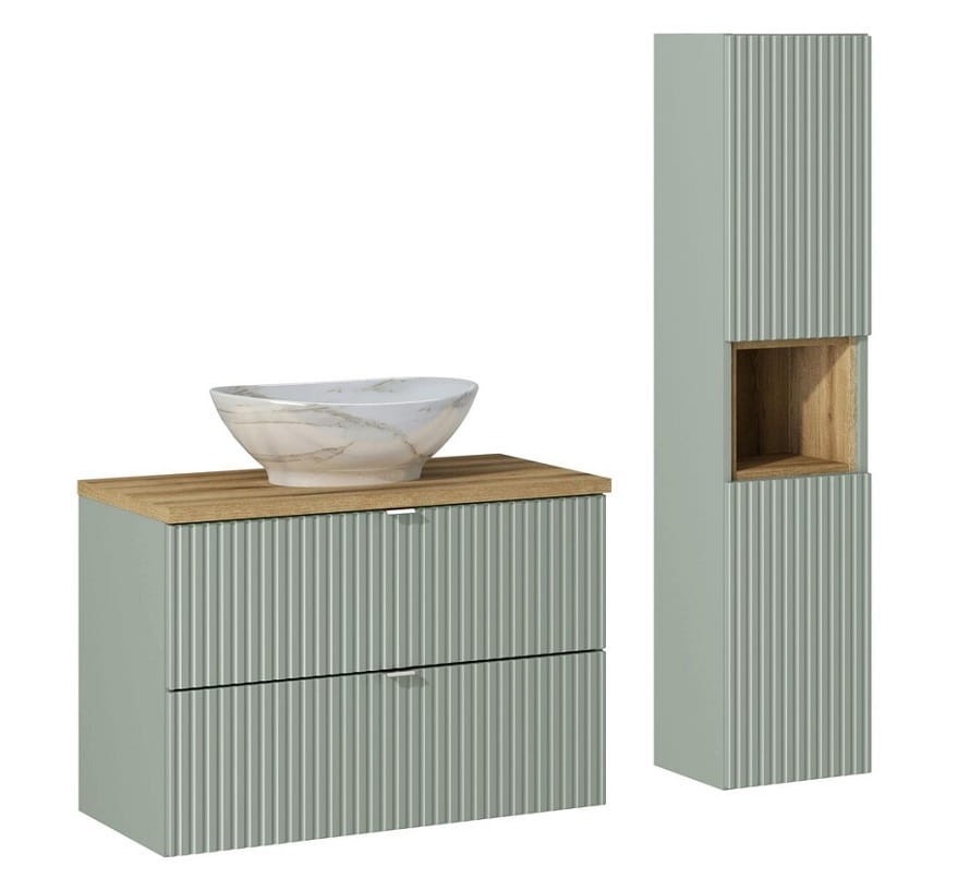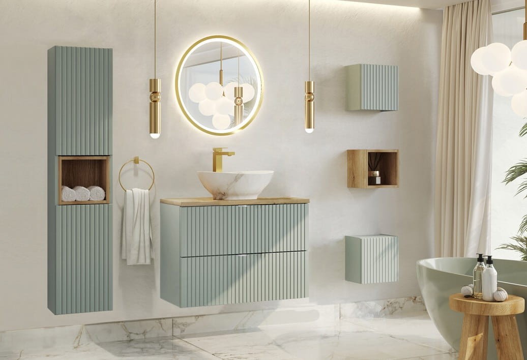 Zestaw mebli łazienkowych Greeno to połączenie nowoczesnego wzornictwa z funkcjonalnością, które doskonale wpisuje się w aktualne trendy aranżacji wnętrz. Te ryflowane meble łazienkowe wprowadzają do przestrzeni unikalny charakter dzięki starannie frezowanym frontom w pastelowym odcieniu szałwi. Pionowe ryflowania nadają im wyjątkowego stylu, a jednocześnie subtelnej elegancji, która harmonizuje zarówno z minimalistycznymi, jak i bardziej klasycznymi łazienkami. Srebrne uchwyty nie tylko dodają szyku, ale również są wygodne w codziennym użytkowaniu.