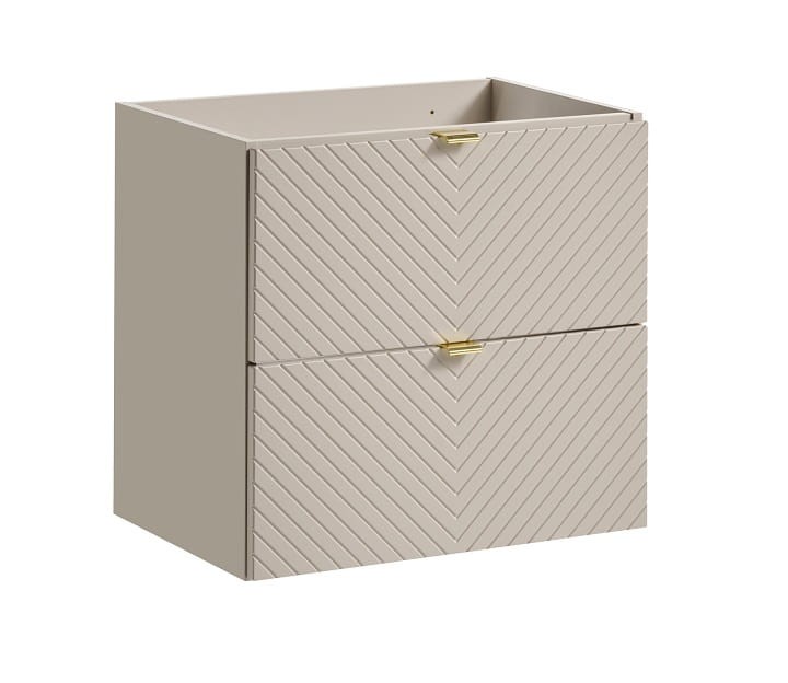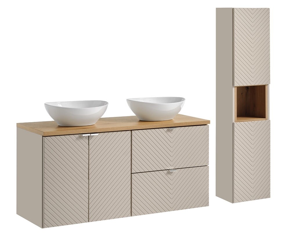 Ten wyjątkowy zestaw wiszących mebli łazienkowych zachwyca już na pierwszy rzut oka wyrafinowanym połączeniem ciepłego odcienia cashmere z ryflowanymi frontami ułożonymi w elegancką jodełkę. Geometryczny wzór w połączeniu z matowym wykończeniem nadaje meblom niepowtarzalny charakter, idealnie wpisujący się w aktualne trendy wzornicze. Komplet składa się z przemyślanie zaprojektowanych elementów: dwóch pojemnych szafek pod umywalkę (jedna wyposażona w praktyczne szuflady, druga w wygodne półki), smukłego słupka z dodatkowymi półkami oraz blatu w naturalnym odcieniu dębu, zwieńczonego dwiema eleganckimi umywalkami nadblatowymi w klasycznej bieli.