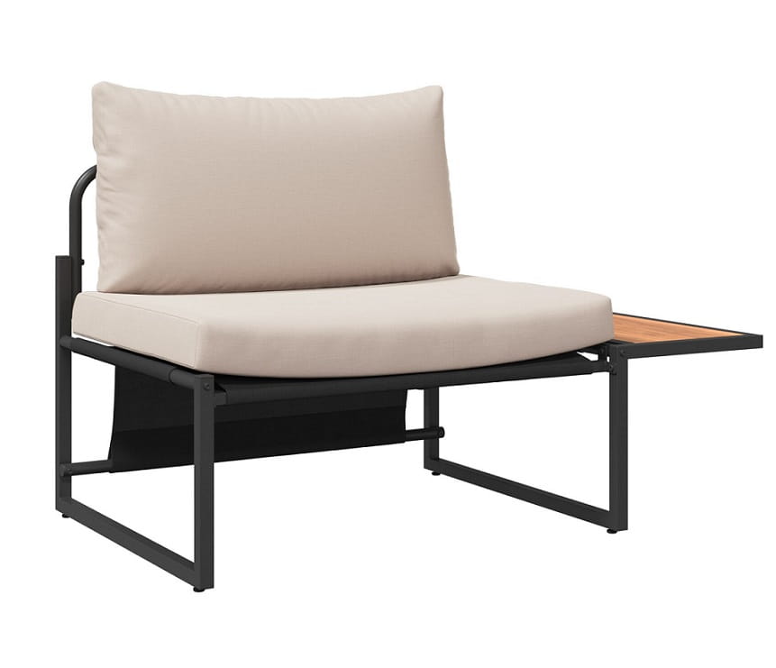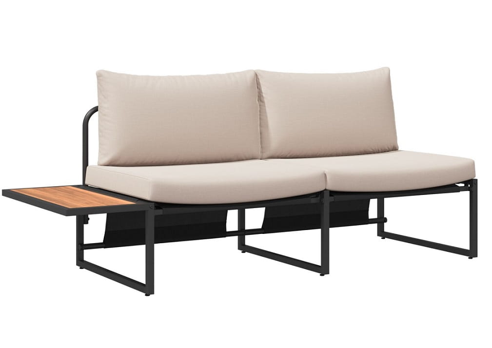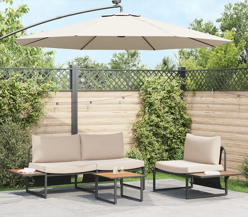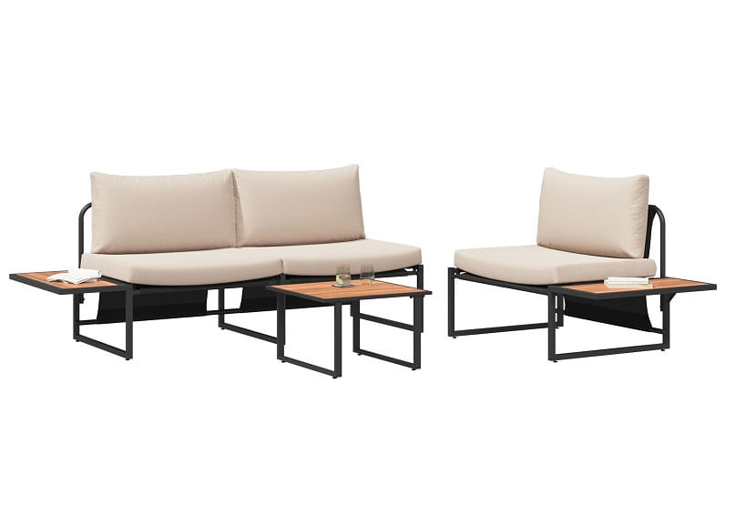 Ponadczasowa elegancja zestawu Regino wyraża się poprzez harmonijne połączenie czarnych, stalowych ram malowanych proszkowo z ciepłymi, drewnianymi elementami półek oraz jasnych poduszek. Minimalistyczna, a jednocześnie przemyślana konstrukcja sprawia, że komplet ten doskonale wpisuje się zarówno w nowoczesne aranżacje miejskich balkonów, jak i bardziej rustykalne przestrzenie rozległych tarasów czy ogrodów. Zmienne warunki atmosferyczne nie są wyzwaniem dla solidnej konstrukcji zestawu Regino. Stal malowana techniką proszkową gwarantuje wyjątkową odporność na korozję i uszkodzenia mechaniczne, co przekłada się na długoletnie użytkowanie bez utraty walorów estetycznych. Półki wykonane z wysokiej jakości drewna zostały odpowiednio zabezpieczone, by oprzeć się wilgoci i promieniowaniu UV.