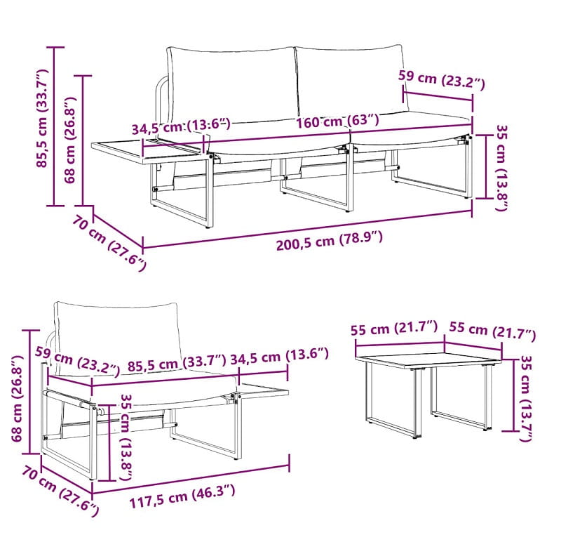 - Zestaw zawiera: 2-osobowa sofa, stolik kawowy, fotel