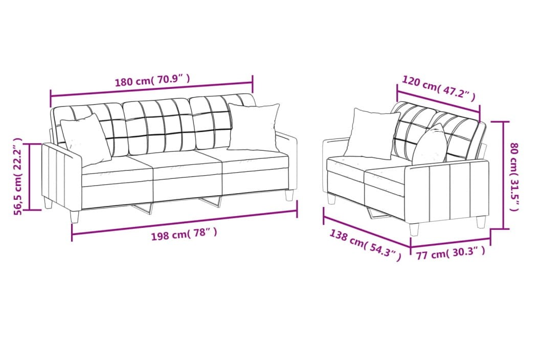 - Wymiary: sofa 2-osobowa wymiary całkowite: szerokość - 138 cm, głębokość - 77 cm, wysokość - 80 cm, szerokość siedziska - 120 cm, głębokość siedziska - 50 cm, wysokość siedziska nad ziemią - 41 cm, wysokość podłokietników nad ziemią - 56,5 cm, sofa 3-osobowa wymiary całkowite: