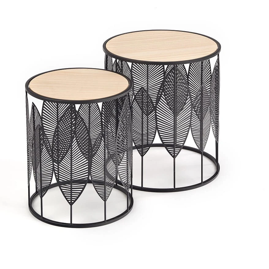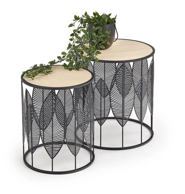 Ponadto - świetnie, nieszablonowo się prezentują. Te dwie ławy niewielkich rozmiarów urozmaicą dosłownie każde wnętrze! Szczególnie, że wyróżnia je interesujące wzornictwo oparte na zdobieniach. Każdy stolik, mniejszy i większy, ma identyczną, metalową konstrukcję, w której motywem przewodnim są liście. Elementy florystyczne doskonale wpisują się w przestrzenie urządzane w hołdzie dla natury. Tym bardziej komponują się tu też blaty stolików z płyty MDF, w kolorze naturalnego drewna. Korespondujące z minimalizmem, industrialem i stylem scandi, gdzie liczy się także ich okrągły, geometryczny kształt.