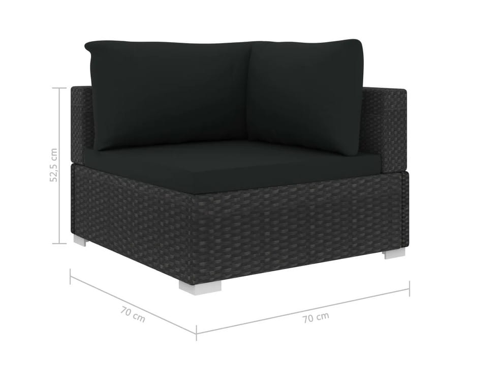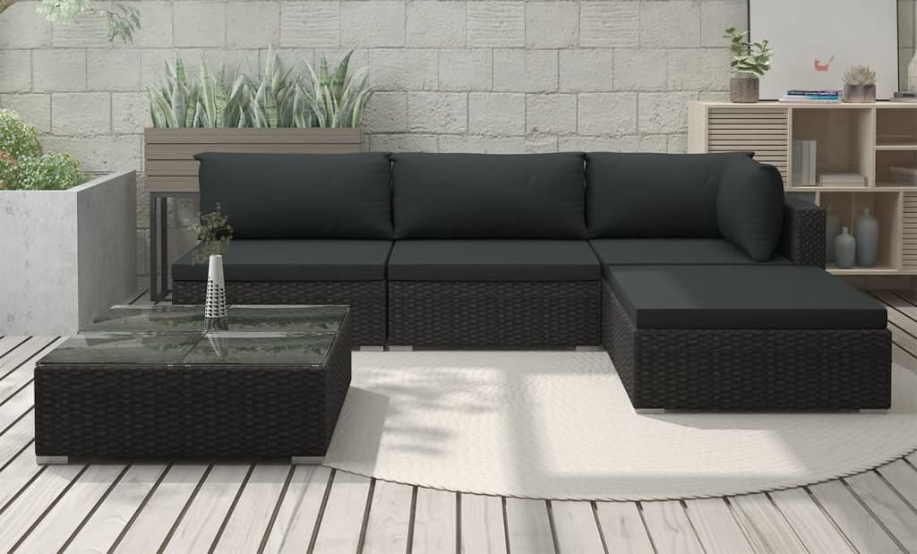 Ogrodowy zestaw wypoczynkowy Karli w kolorze czarnym pozwoli cieszyć się urodą każdego dnia spędzonego na świeżym powietrzu. Jest stabilny, komfortowy, pełen klasy. Składa się z pięciu części. W komplecie tym znajduje sofa, podnóżek, a także funkcjonalny stolik kawowy. Całość dopełniają grube poduszki na siedziska i oparcia w stylowym, czarnym odcieniu. Miękkie elementy zabezpieczone są pokrowcami, które w łatwy sposób można zdjąć i wyprać. Konstrukcję wystarczy przetrzeć wilgotną ściereczką, by nabrała blasku. Cały polirattanowy zestaw do ogrodu łatwo jest utrzymać w czystości. Ponadto nie poddaje się on działaniu wilgoci oraz słońca i nie płowieje. Dzięki temu posłuży przez wiele fantastycznych sezonów.